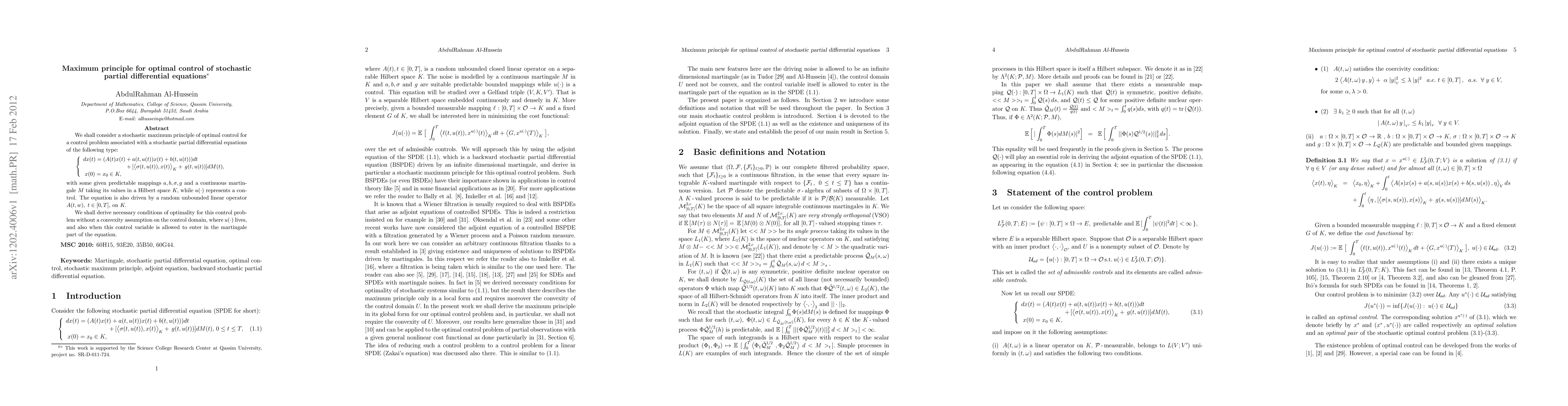 The paper presents a stochastic maximum principle for optimal control of stochastic partial differential equations, providing necessary conditions of optimality without convexity assumptions on the control domain.