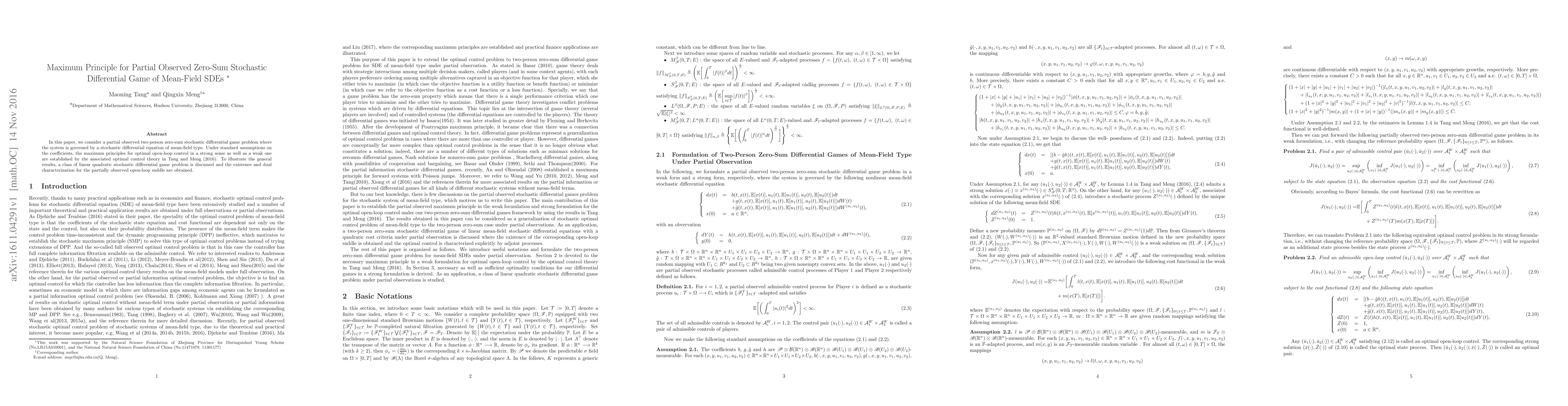 In this paper, we consider a partial observed two-person zero-sum stochastic differential game problem where the system is governed by a stochastic differential equation of mean-field type. Under standard assumptions on the coefficients, the maximum principles for optimal open-loop control in a strong sense as well as a weak one are established by the associated optimal control theory in Tang and Meng (2016). To illustrate the general results, a class of linear quadratic stochastic differential game problem is discussed and the existence and dual characterization for the partially observed open-loop saddle are obtained.
