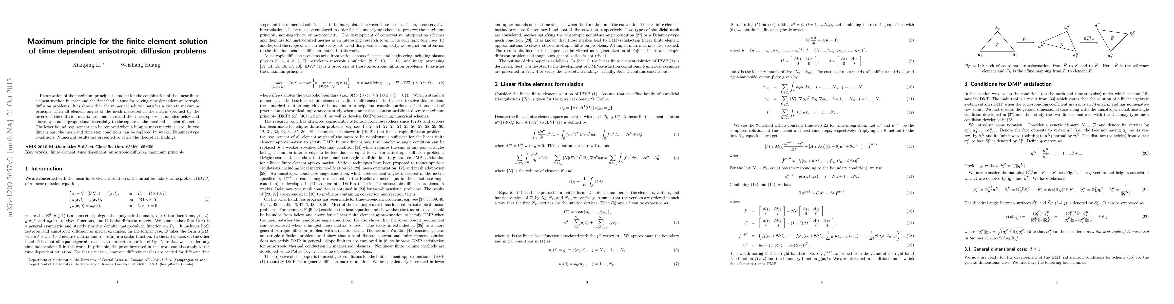 This paper investigates the preservation of the maximum principle for the finite element solution of time-dependent anisotropic diffusion problems using the linear finite element method and the $\theta$-method. It demonstrates that the numerical solution adheres to a discrete maximum principle under specific mesh and time step conditions, which can be relaxed in two dimensions and when using a lumped mass matrix.