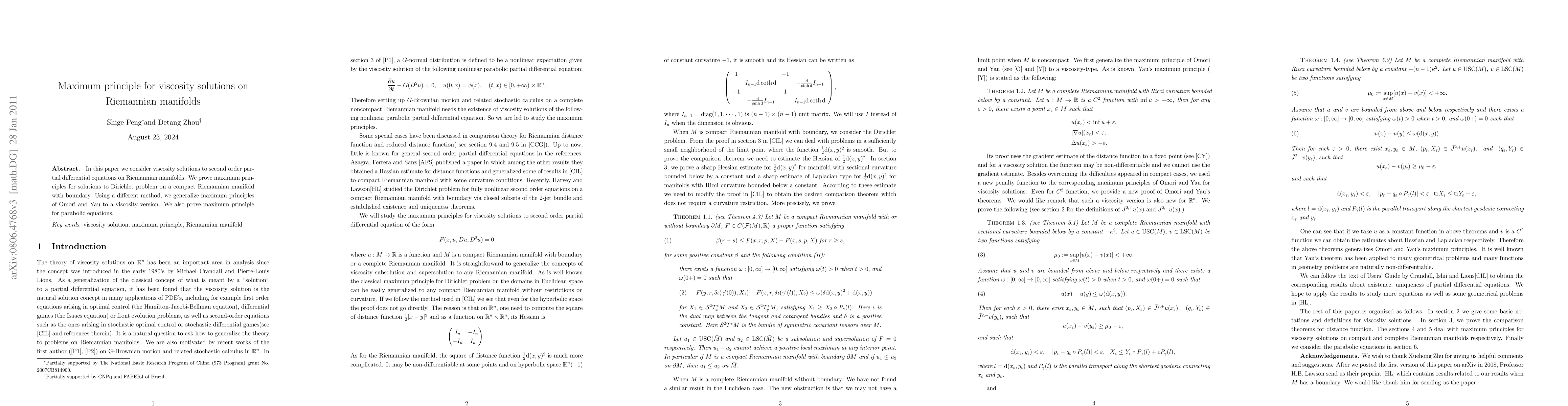 This paper proves maximum principles for viscosity solutions to second-order PDEs on Riemannian manifolds, extending the classical maximum principles of Omori and Yau to a viscosity context for the Dirichlet problem on compact manifolds with boundary.