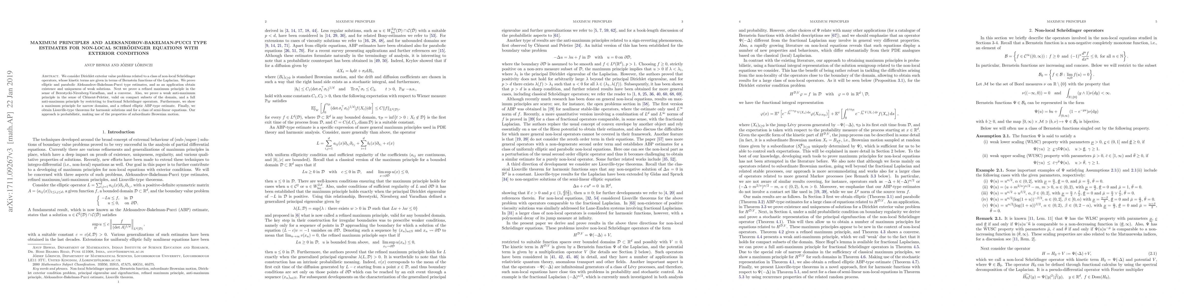 We consider Dirichlet exterior value problems related to a class of non-local Schr\"odinger operators, whose kinetic terms are given in terms of Bernstein functions of the Laplacian. We prove elliptic and parabolic Aleksandrov-Bakelman-Pucci type estimates, and as an application obtain existence and uniqueness of weak solutions. Next we prove a refined maximum principle in the sense of Berestycki-Nirenberg-Varadhan, and a converse. Also, we prove a weak anti-maximum principle in the sense of Cl\'ement-Peletier, valid on compact subsets of the domain, and a full anti-maximum principle by restricting to fractional Schr\"odinger operators. Furthermore, we show a maximum principle for narrow domains, and a refined elliptic ABP-type estimate. Finally, we obtain Liouville-type theorems for harmonic solutions and for a class of semi-linear equations. Our approach is probabilistic, making use of the properties of subordinate Brownian motion.