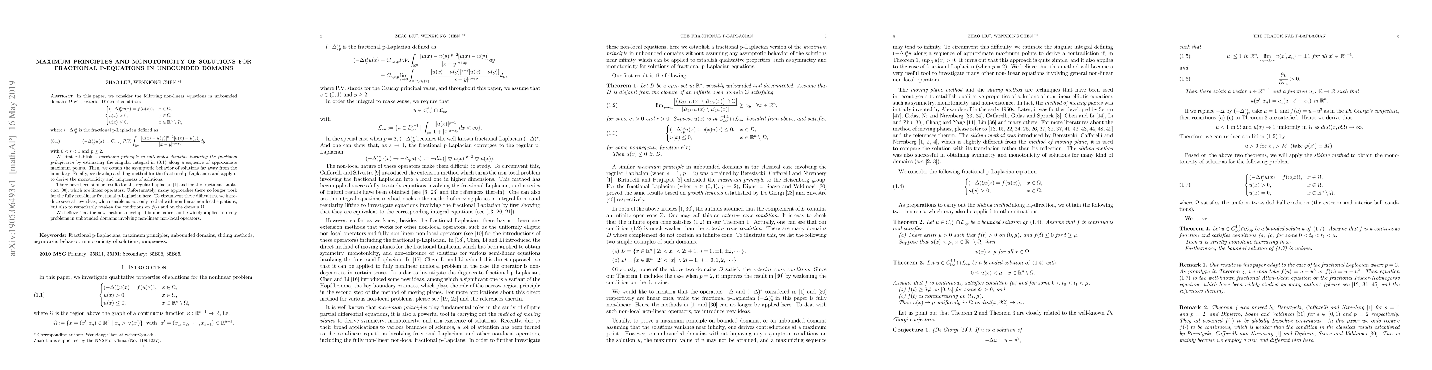 This paper establishes a maximum principle and proves monotonicity and uniqueness of solutions for non-linear fractional p-equations in unbounded domains, using novel methods to handle the fully non-linear and non-local nature of the fractional p-Laplacian, thus extending previous results for linear operators.