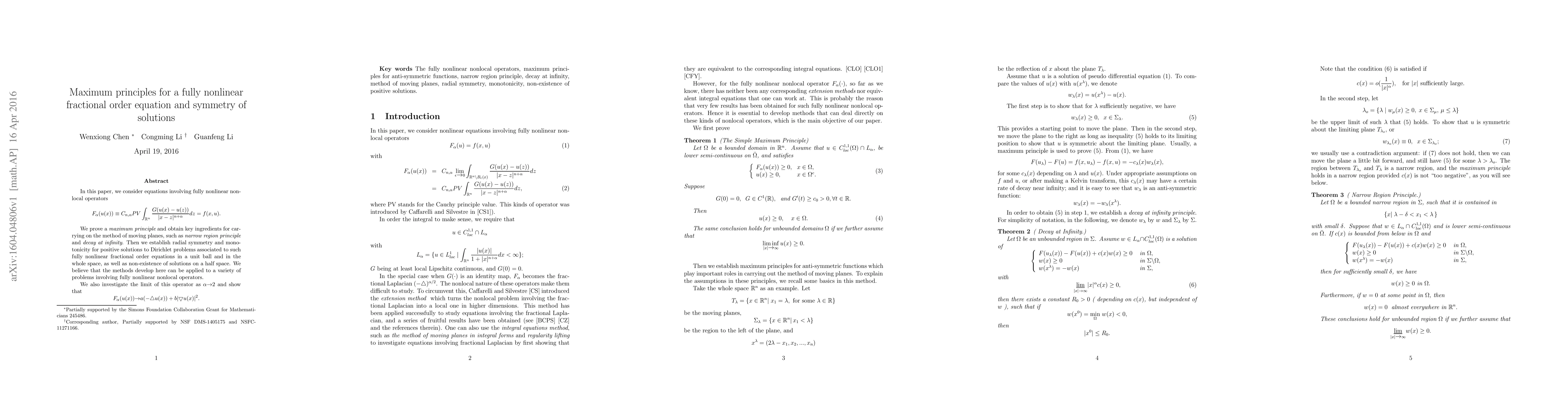 This paper explores fully nonlinear fractional order equations involving nonlocal operators, proving a maximum principle and establishing symmetry and monotonicity for positive solutions in various domains. It also investigates the limit behavior of the operator as the fractional order approaches a second-order differential operator.