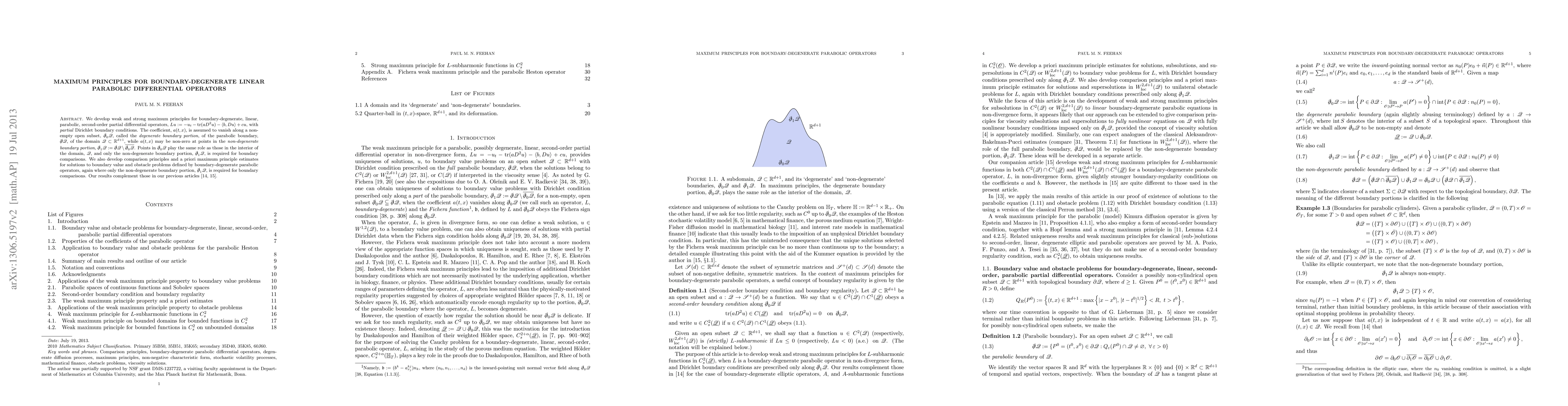 This paper develops weak and strong maximum principles for linear, parabolic, second-order differential operators with partial Dirichlet boundary conditions, focusing on cases where the coefficient matrix degenerates along a portion of the boundary. It also establishes comparison principles and a priori estimates for solutions to boundary value and obstacle problems, emphasizing the non-degenerate boundary portion for boundary comparisons.