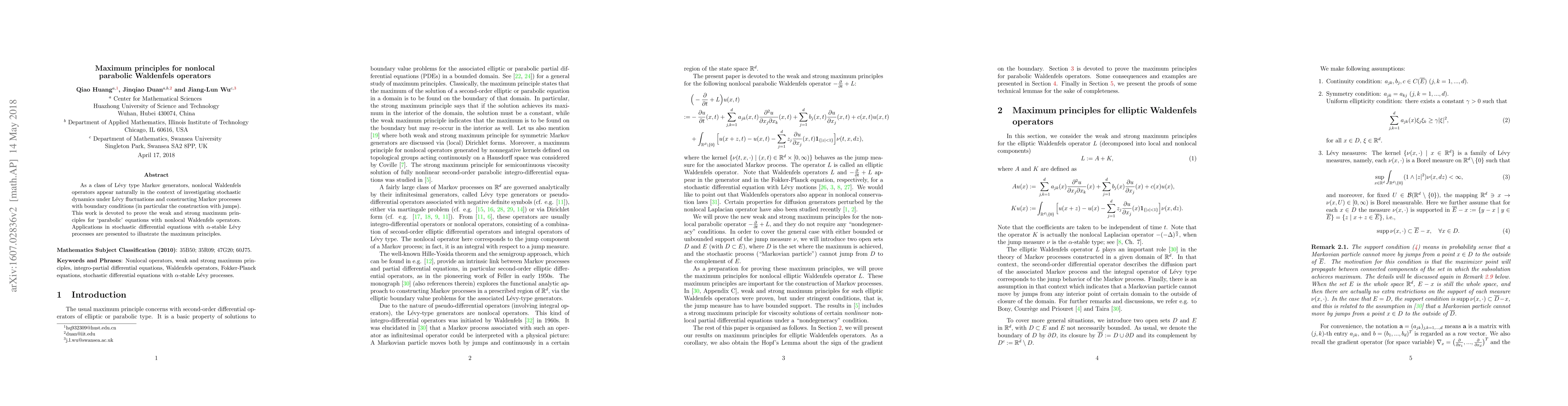 This paper proves weak and strong maximum principles for parabolic equations involving nonlocal Waldenfels operators, which are L\'evy type Markov generators, and applies these principles to stochastic differential equations with $\alpha$-stable L\'evy processes.