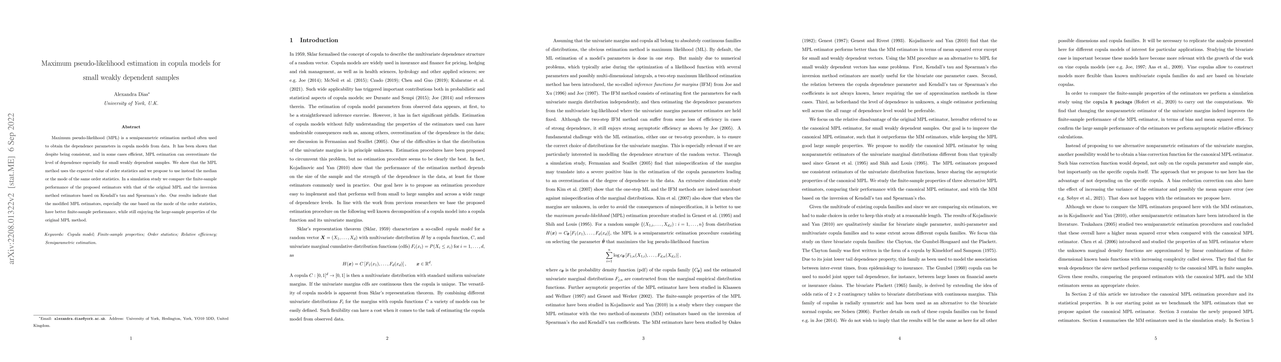 This paper proposes modified maximum pseudo-likelihood (MPL) estimators for copula models that use the median or mode of order statistics instead of their expected values to better handle small weakly dependent samples. Simulation results show improved finite-sample performance of the proposed estimators over the original MPL and inversion method estimators.