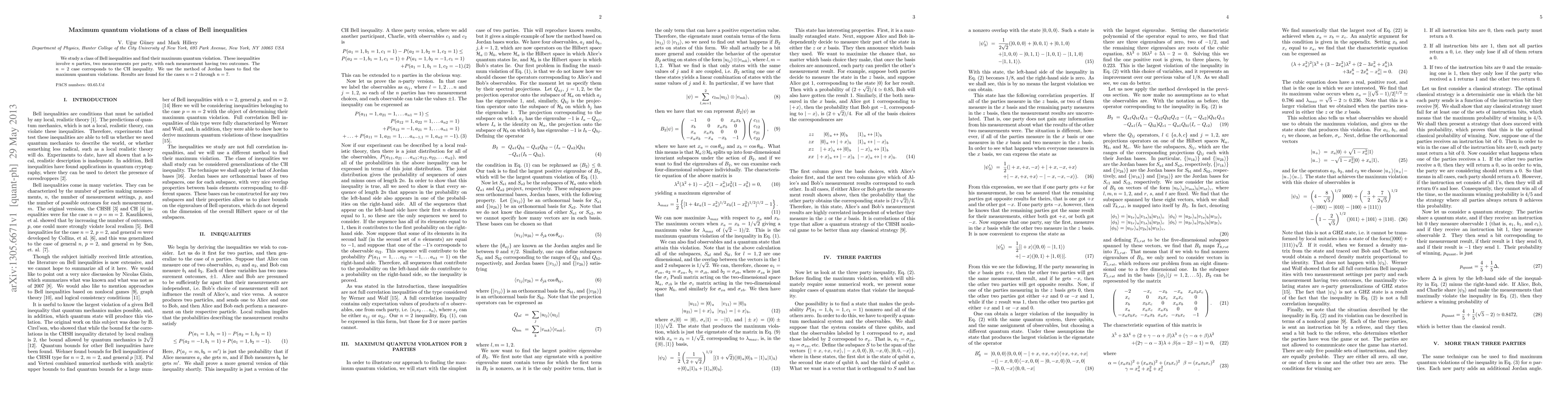 This paper investigates a class of Bell inequalities involving multiple parties and measurements, determining the maximum quantum violations for n parties (n=2 to n=7). The study employs the method of Jordan bases to achieve these results, extending beyond the classical CH inequality.