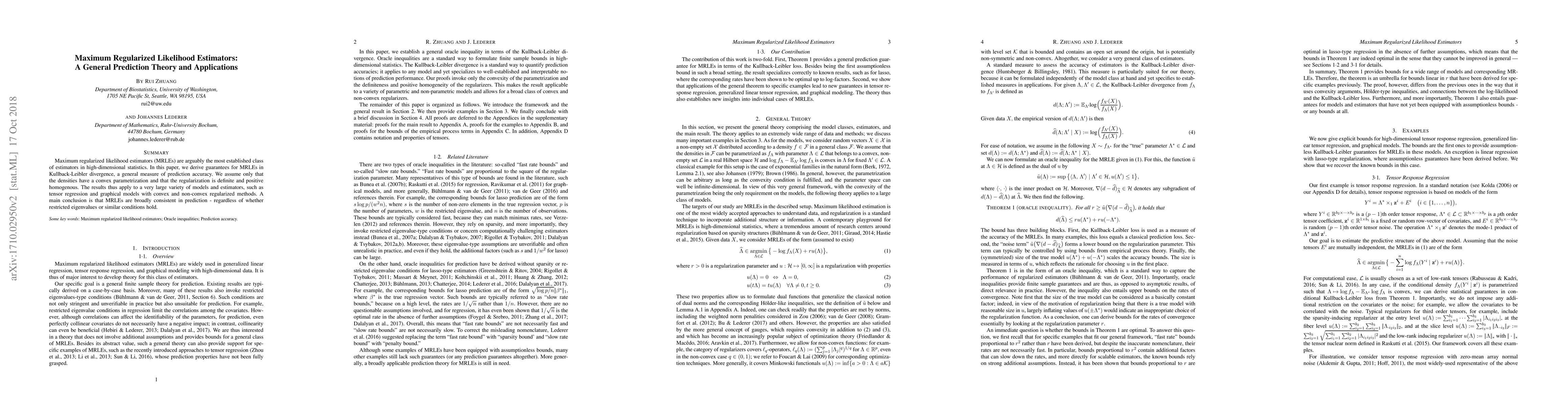 This paper derives prediction accuracy guarantees for maximum regularized likelihood estimators (MRLEs) in high-dimensional statistics, showing their consistency in Kullback-Leibler divergence under minimal assumptions. The findings apply to a wide range of models, including tensor regression and graphical models, regardless of specific conditions like restricted eigenvalues.