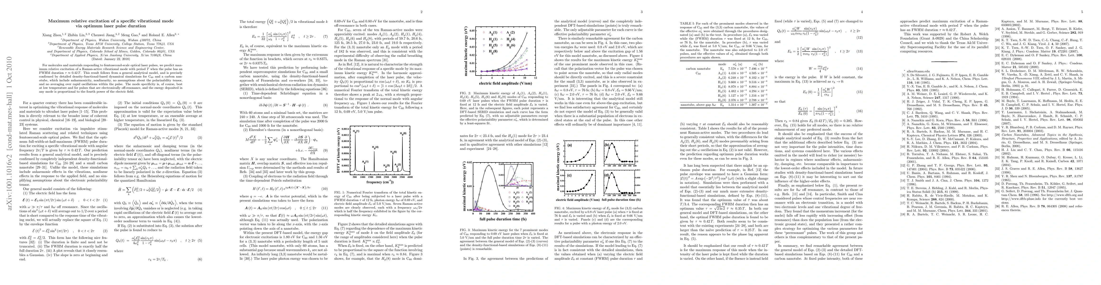For molecules and materials responding to femtosecond-scale optical laser pulses, we predict maximum relative excitation of a Raman-active vibrational mode with period T when the pulse has an FWHM duration of 0.42 T. This result follows from a general analytical model, and is precisely confirmed by detailed density-functional-based dynamical simulations for C60 and a carbon nanotube, which include anharmonicity, nonlinearity, no assumptions about the polarizability tensor, and no averaging over rapid oscillations within the pulse. The mode specificity is, of course, best at low temperature and for pulses that are electronically off-resonance, and the energy deposited in any mode is proportional to the fourth power of the electric field.