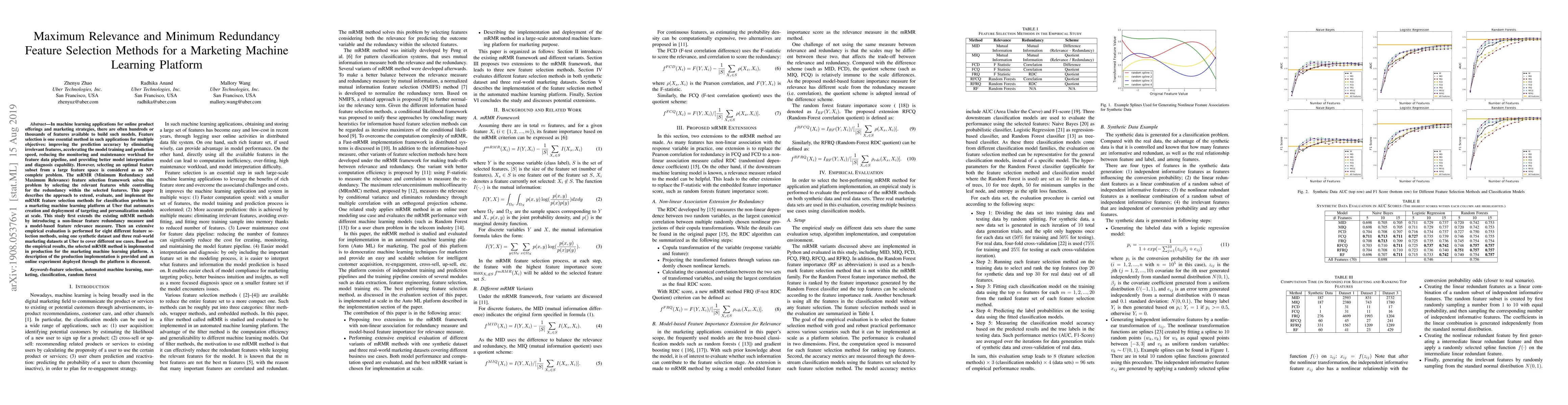 In machine learning applications for online product offerings and marketing strategies, there are often hundreds or thousands of features available to build such models. Feature selection is one essential method in such applications for multiple objectives: improving the prediction accuracy by eliminating irrelevant features, accelerating the model training and prediction speed, reducing the monitoring and maintenance workload for feature data pipeline, and providing better model interpretation and diagnosis capability. However, selecting an optimal feature subset from a large feature space is considered as an NP-complete problem. The mRMR (Minimum Redundancy and Maximum Relevance) feature selection framework solves this problem by selecting the relevant features while controlling for the redundancy within the selected features. This paper describes the approach to extend, evaluate, and implement the mRMR feature selection methods for classification problem in a marketing machine learning platform at Uber that automates creation and deployment of targeting and personalization models at scale. This study first extends the existing mRMR methods by introducing a non-linear feature redundancy measure and a model-based feature relevance measure. Then an extensive empirical evaluation is performed for eight different feature selection methods, using one synthetic dataset and three real-world marketing datasets at Uber to cover different use cases. Based on the empirical results, the selected mRMR method is implemented in production for the marketing machine learning platform. A description of the production implementation is provided and an online experiment deployed through the platform is discussed.