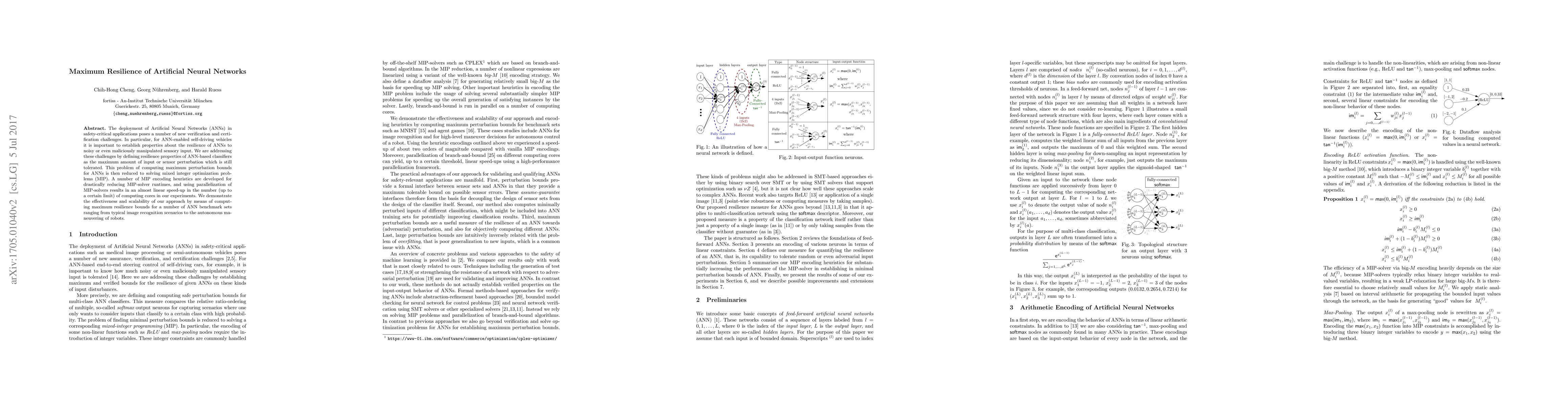 The deployment of Artificial Neural Networks (ANNs) in safety-critical applications poses a number of new verification and certification challenges. In particular, for ANN-enabled self-driving vehicles it is important to establish properties about the resilience of ANNs to noisy or even maliciously manipulated sensory input. We are addressing these challenges by defining resilience properties of ANN-based classifiers as the maximal amount of input or sensor perturbation which is still tolerated. This problem of computing maximal perturbation bounds for ANNs is then reduced to solving mixed integer optimization problems (MIP). A number of MIP encoding heuristics are developed for drastically reducing MIP-solver runtimes, and using parallelization of MIP-solvers results in an almost linear speed-up in the number (up to a certain limit) of computing cores in our experiments. We demonstrate the effectiveness and scalability of our approach by means of computing maximal resilience bounds for a number of ANN benchmark sets ranging from typical image recognition scenarios to the autonomous maneuvering of robots.