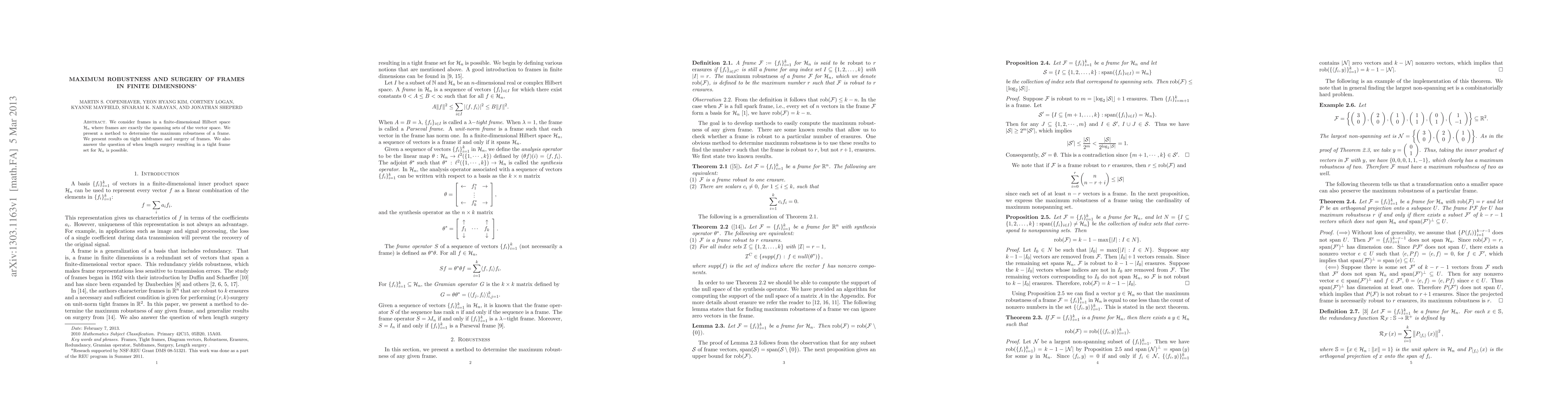 We consider frames in a finite-dimensional Hilbert space Hn where frames are exactly the spanning sets of the vector space. We present a method to determine the maximum robustness of a frame. We present results on tight subframes and surgery of frames. We also answer the question of when length surgery resulting in a tight frame set for Hn is possible.