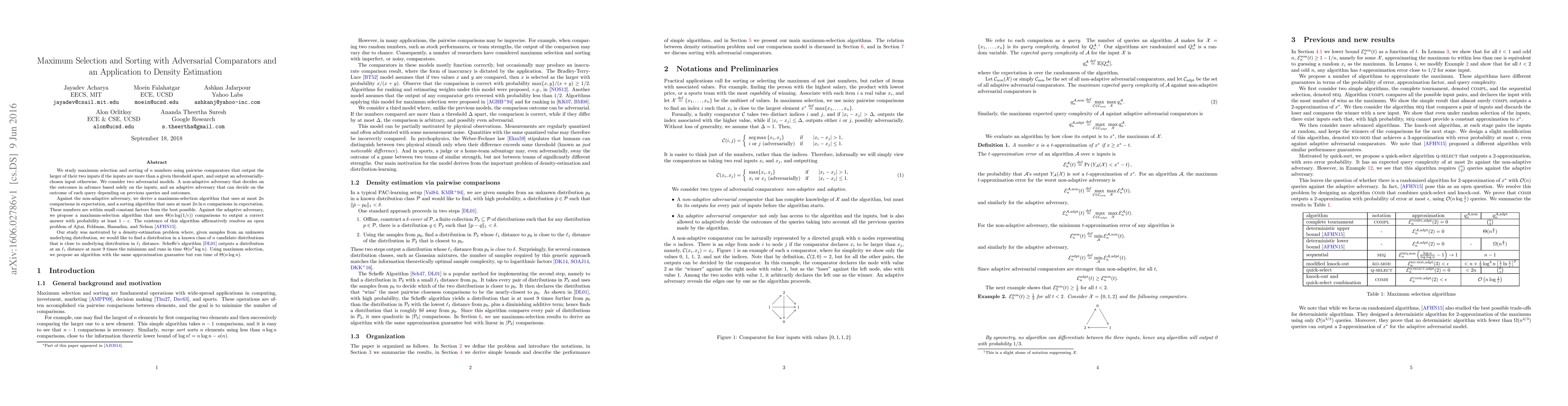 We study maximum selection and sorting of $n$ numbers using pairwise comparators that output the larger of their two inputs if the inputs are more than a given threshold apart, and output an adversarially-chosen input otherwise. We consider two adversarial models. A non-adaptive adversary that decides on the outcomes in advance based solely on the inputs, and an adaptive adversary that can decide on the outcome of each query depending on previous queries and outcomes. Against the non-adaptive adversary, we derive a maximum-selection algorithm that uses at most $2n$ comparisons in expectation, and a sorting algorithm that uses at most $2n \ln n$ comparisons in expectation. These numbers are within small constant factors from the best possible. Against the adaptive adversary, we propose a maximum-selection algorithm that uses $\Theta(n\log (1/{\epsilon}))$ comparisons to output a correct answer with probability at least $1-\epsilon$. The existence of this algorithm affirmatively resolves an open problem of Ajtai, Feldman, Hassadim, and Nelson. Our study was motivated by a density-estimation problem where, given samples from an unknown underlying distribution, we would like to find a distribution in a known class of $n$ candidate distributions that is close to underlying distribution in $\ell_1$ distance. Scheffe's algorithm outputs a distribution at an $\ell_1$ distance at most 9 times the minimum and runs in time $\Theta(n^2\log n)$. Using maximum selection, we propose an algorithm with the same approximation guarantee but run time of $\Theta(n\log n)$.