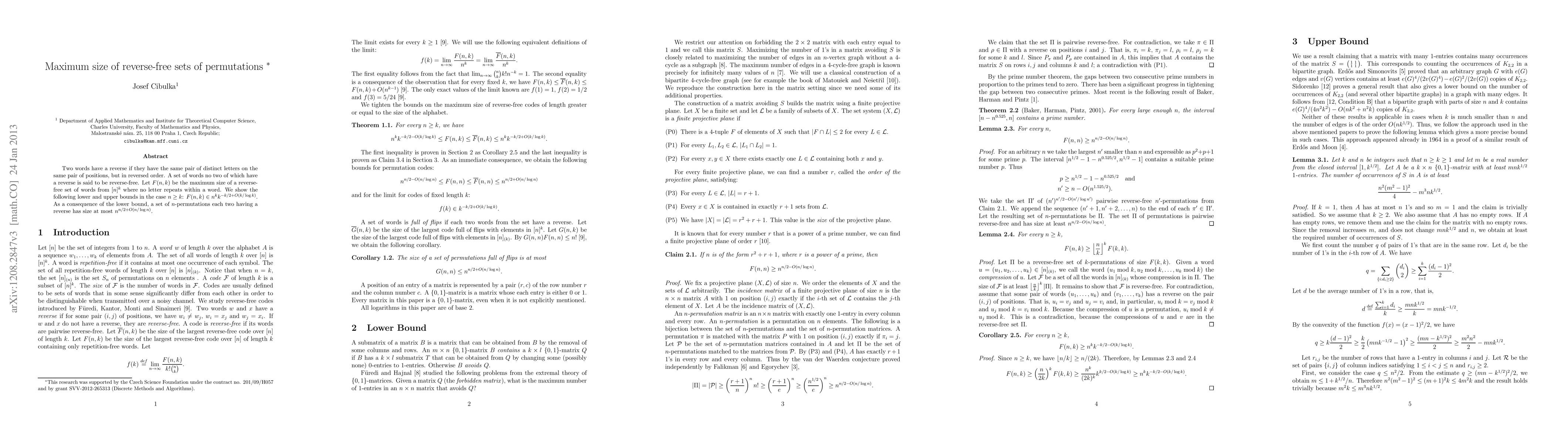 Two words have a reverse if they have the same pair of distinct letters on the same pair of positions, but in reversed order. A set of words no two of which have a reverse is said to be reverse-free. Let F(n,k) be the maximum size of a reverse-free set of words from [n]^k where no letter repeats within a word. We show the following lower and upper bounds in the case n >= k: F(n,k) \in n^k k^{-k/2 + O(k/log k)}. As a consequence of the lower bound, a set of n-permutations each two having a reverse has size at most n^{n/2 + O(n/log n)}.