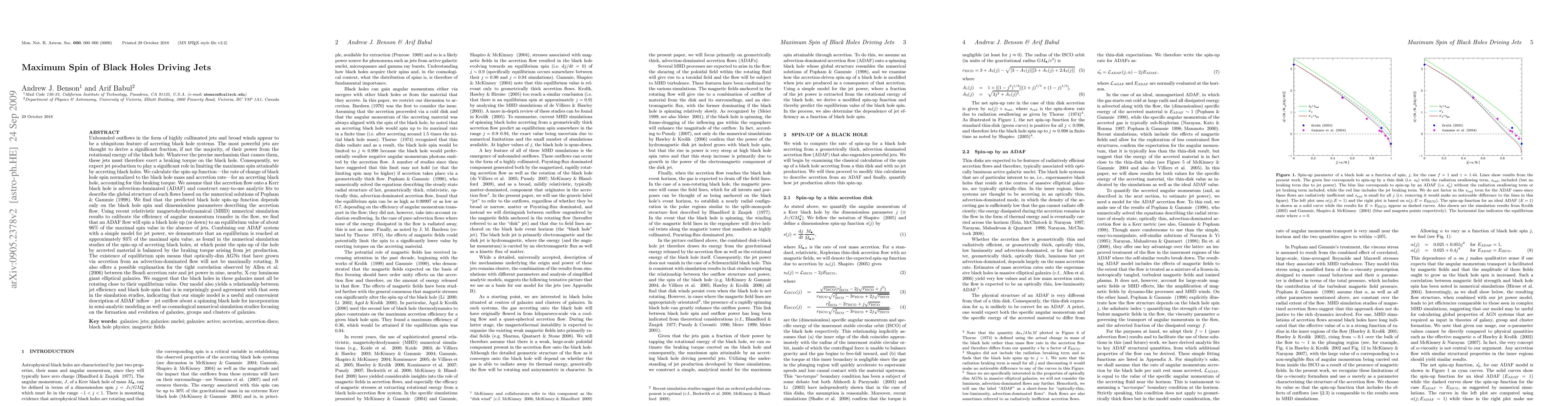 Unbounded outflows in the form of highly collimated jets and broad winds appear to be a ubiquitous feature of accreting black hole systems. The most powerful jets are thought to derive a significant fraction, if not the majority, of their power from the rotational energy of the black hole. Whatever the precise mechanism that causes them, these jets must therefore exert a braking torque on the black hole. We calculate the spin-up function for an accreting black hole, accounting for this braking torque. We find that the predicted black hole spin-up function depends only on the black hole spin and dimensionless parameters describing the accretion flow. Using recent relativistic magnetohydrodynamical numerical simulation results to calibrate the efficiency of angular momentum transfer in the flow, we find that an ADAF flow will spin a black hole up (or down) to an equilibrium value of about 96% of the maximal spin value in the absence of jets. Combining our ADAF system with a simple model for jet power, we demonstrate that an equilibrium is reached at approximately 93% of the maximal spin value, as found in the numerical simulation studies of the spin-up of accreting black holes, at which point the spin-up of the hole by accreted material is balanced by the braking torque arising from jet production. Our model also yields a relationship between jet efficiency and black hole spin that is in surprisingly good agreement with that seen in the simulation studies, indicating that our simple model is a useful and convenient description of ADAF inflow - jet outflow about a spinning black hole for incorporation in models of the formation and evolution of galaxies, groups and clusters of galaxies.