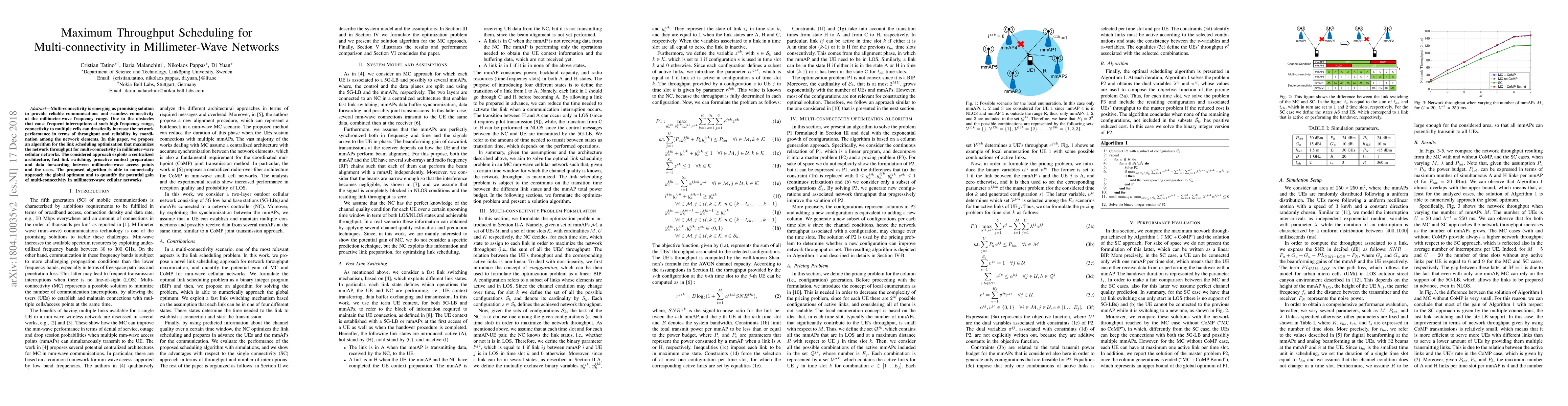 This paper proposes an algorithm for optimizing link scheduling to maximize throughput in multi-connectivity millimeter-wave networks, leveraging centralized coordination, fast link switching, and proactive data forwarding. The approach demonstrates significant gains in network performance and reliability compared to single-connectivity setups.