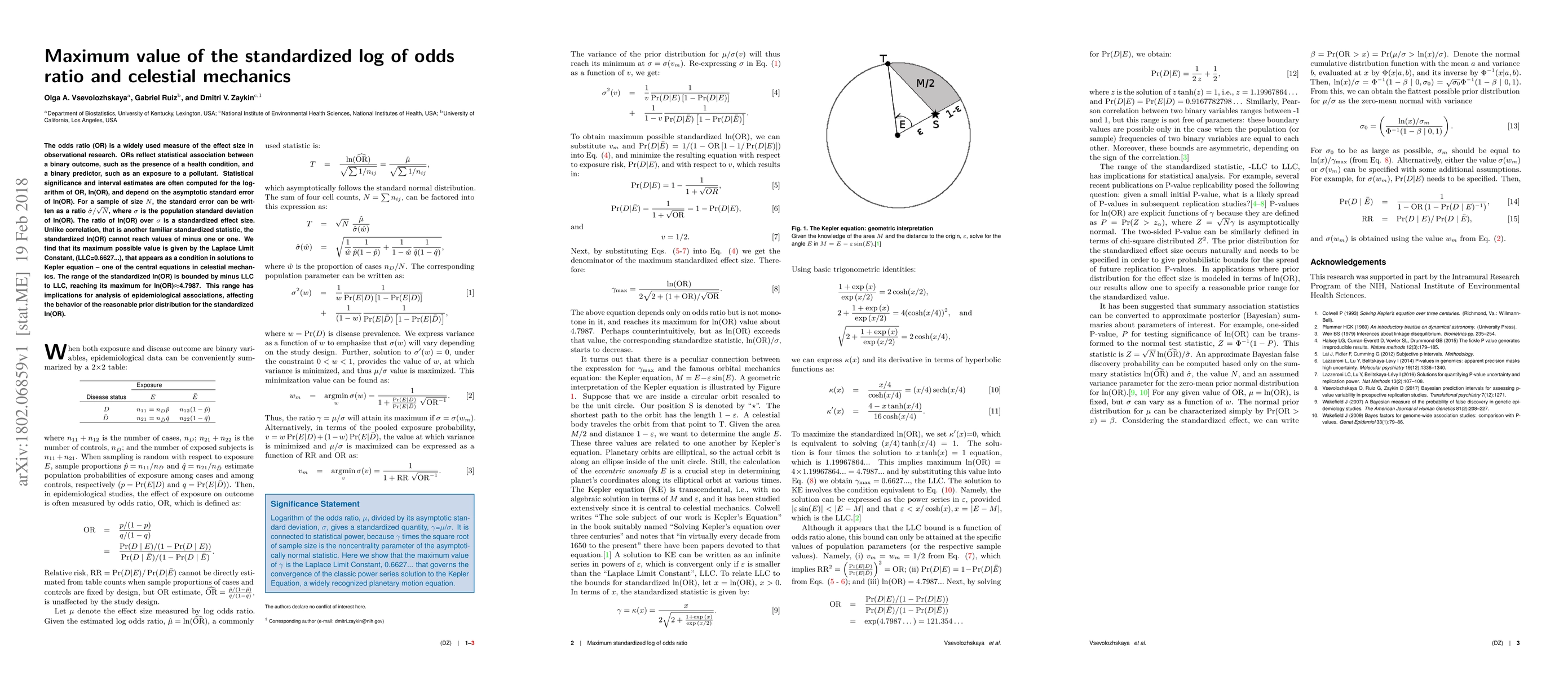 The odds ratio (OR) is a widely used measure of the effect size in observational research. ORs reflect statistical association between a binary outcome, such as the presence of a health condition, and a binary predictor, such as an exposure to a pollutant. Statistical significance and interval estimates are often computed for the logarithm of OR, ln(OR), and depend on the asymptotic standard error of ln(OR). For a sample of size N, the standard error can be written as a ratio of sigma over square root of N, where sigma is the population standard deviation of ln(OR). The ratio of ln(OR) over sigma is a standardized effect size. Unlike correlation, that is another familiar standardized statistic, the standardized ln(OR) cannot reach values of minus one or one. We find that its maximum possible value is given by the Laplace Limit Constant, (LLC=0.6627...), that appears as a condition in solutions to Kepler equation -- one of the central equations in celestial mechanics. The range of the standardized ln(OR) is bounded by minus LLC to LLC, reaching its maximum for ln(OR)~4.7987. This range has implications for analysis of epidemiological associations, affecting the behavior of the reasonable prior distribution for the standardized ln(OR).
