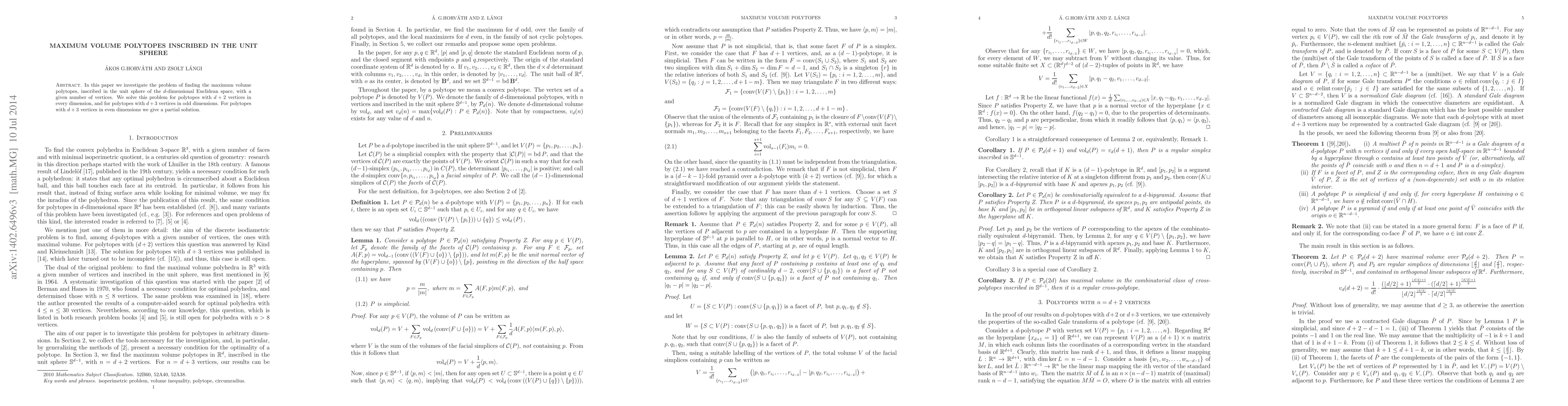 This paper determines the maximum volume polytopes inscribed in the unit sphere of $d$-dimensional space for specific vertex counts, solving the problem completely for $d+2$ vertices in any dimension and for $d+3$ vertices in odd dimensions, while providing a partial solution for even dimensions.