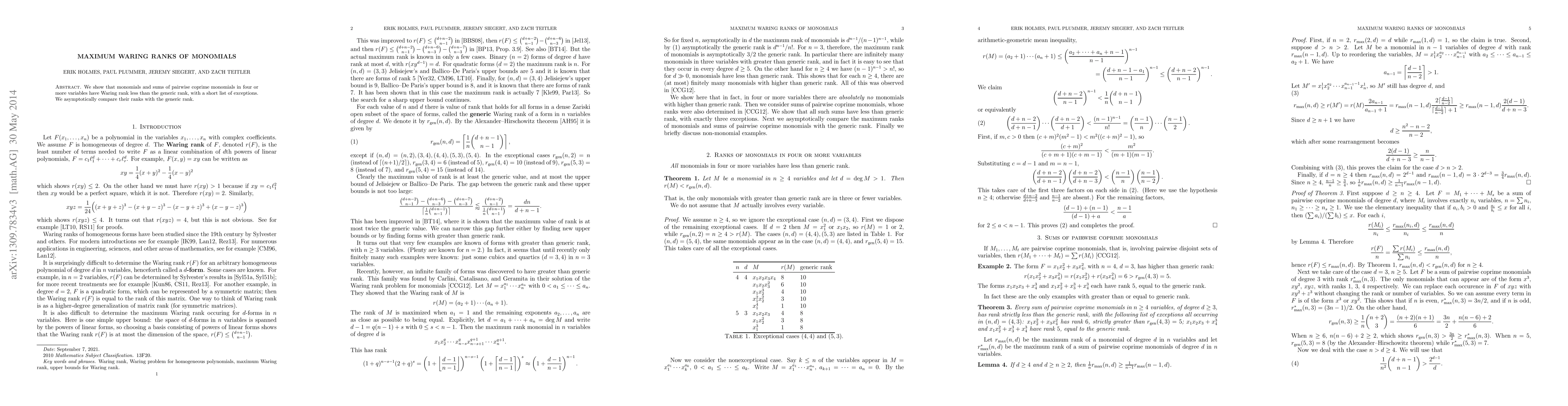 This paper demonstrates that monomials and sums of pairwise coprime monomials in four or more variables typically have a Waring rank lower than the generic rank, with a few exceptions, and provides an asymptotic comparison of these ranks to the generic rank.