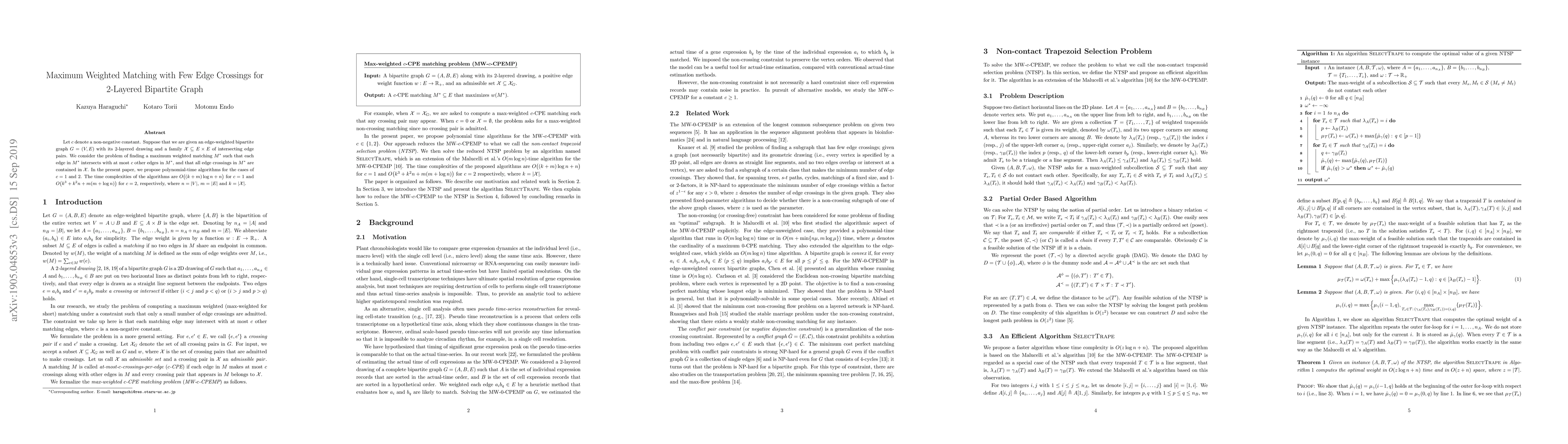 Researchers developed algorithms to maximize weighted matching in 2-layered bipartite graphs with few edge crossings, finding solutions for cases of c=1 and 2 within specific time complexities.