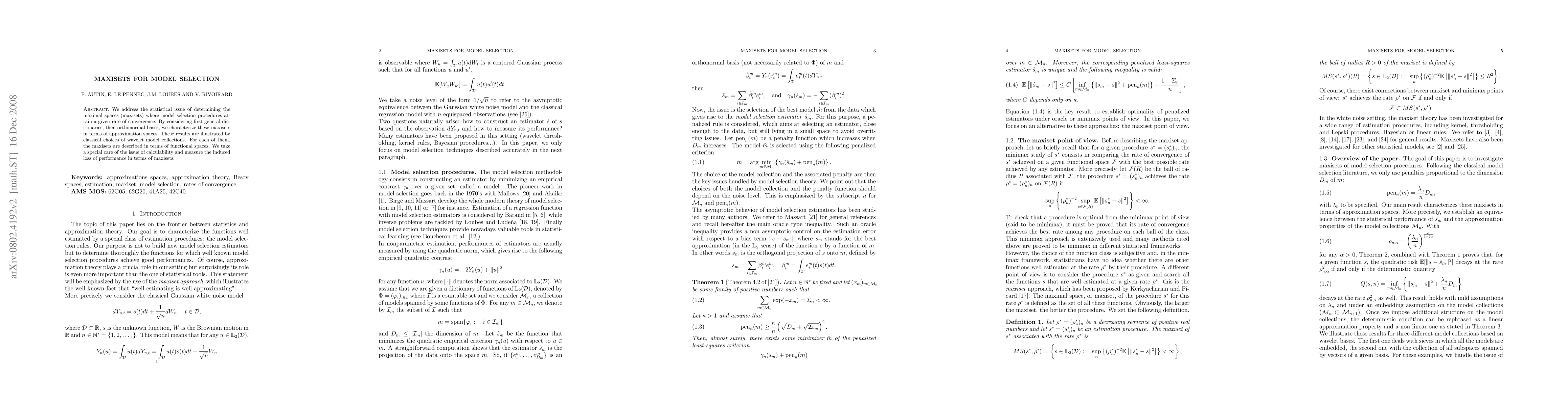 We address the statistical issue of determining the maximal spaces (maxisets) where model selection procedures attain a given rate of convergence. By considering first general dictionaries, then orthonormal bases, we characterize these maxisets in terms of approximation spaces. These results are illustrated by classical choices of wavelet model collections. For each of them, the maxisets are described in terms of functional spaces. We take a special care of the issue of calculability and measure the induced loss of performance in terms of maxisets.
