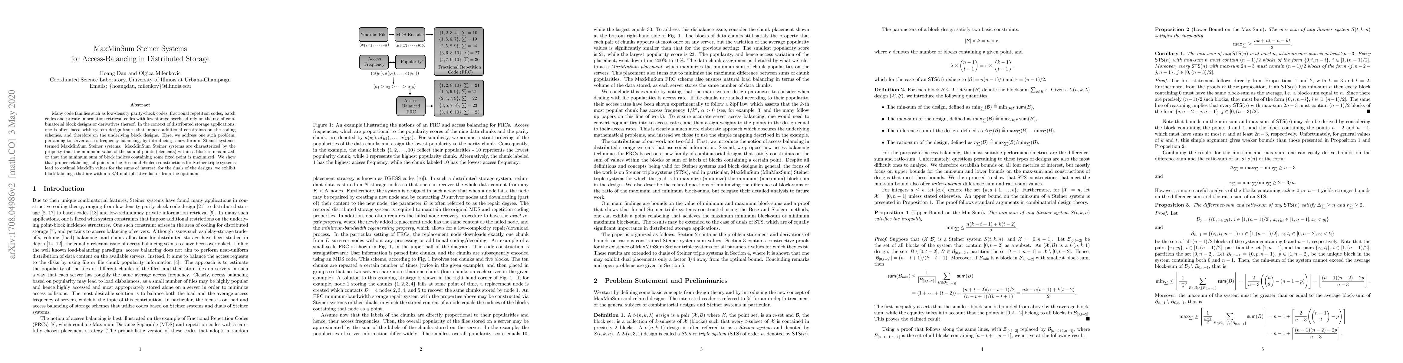 Many code families such as low-density parity-check codes, fractional repetition codes, batch codes and private information retrieval codes with low storage overhead rely on the use of combinatorial block designs or derivatives thereof. In the context of distributed storage applications, one is often faced with system design issues that impose additional constraints on the coding schemes, and therefore on the underlying block designs. Here, we address one such problem, pertaining to server access frequency balancing, by introducing a new form of Steiner systems, termed MaxMinSum Steiner systems. MaxMinSum Steiner systems are characterized by the property that the minimum value of the sum of points (elements) within a block is maximized, or that the minimum sum of block indices containing some fixed point is maximized. We show that proper relabelings of points in the Bose and Skolem constructions for Steiner triple systems lead to optimal MaxMin values for the sums of interest; for the duals of the designs, we exhibit block labelings that are within a 3/4 multiplicative factor from the optimum.