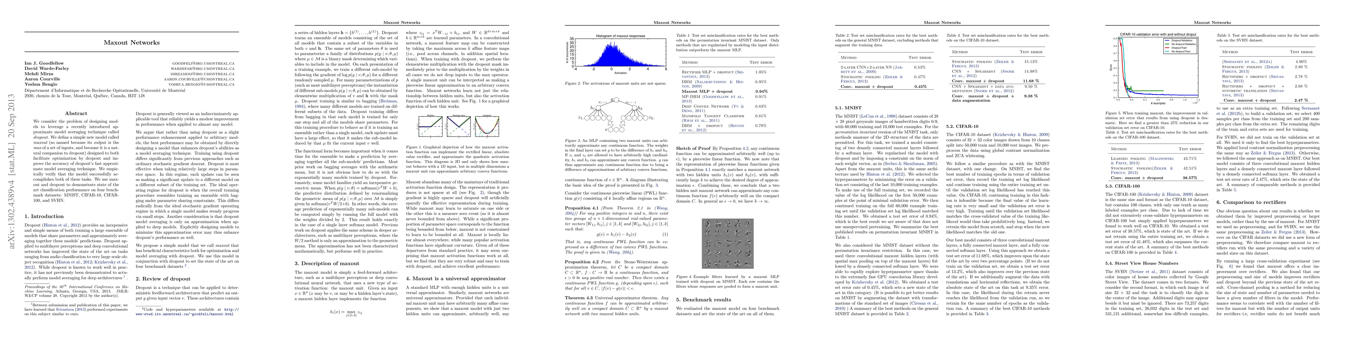 We consider the problem of designing models to leverage a recently introduced approximate model averaging technique called dropout. We define a simple new model called maxout (so named because its output is the max of a set of inputs, and because it is a natural companion to dropout) designed to both facilitate optimization by dropout and improve the accuracy of dropout's fast approximate model averaging technique. We empirically verify that the model successfully accomplishes both of these tasks. We use maxout and dropout to demonstrate state of the art classification performance on four benchmark datasets: MNIST, CIFAR-10, CIFAR-100, and SVHN.