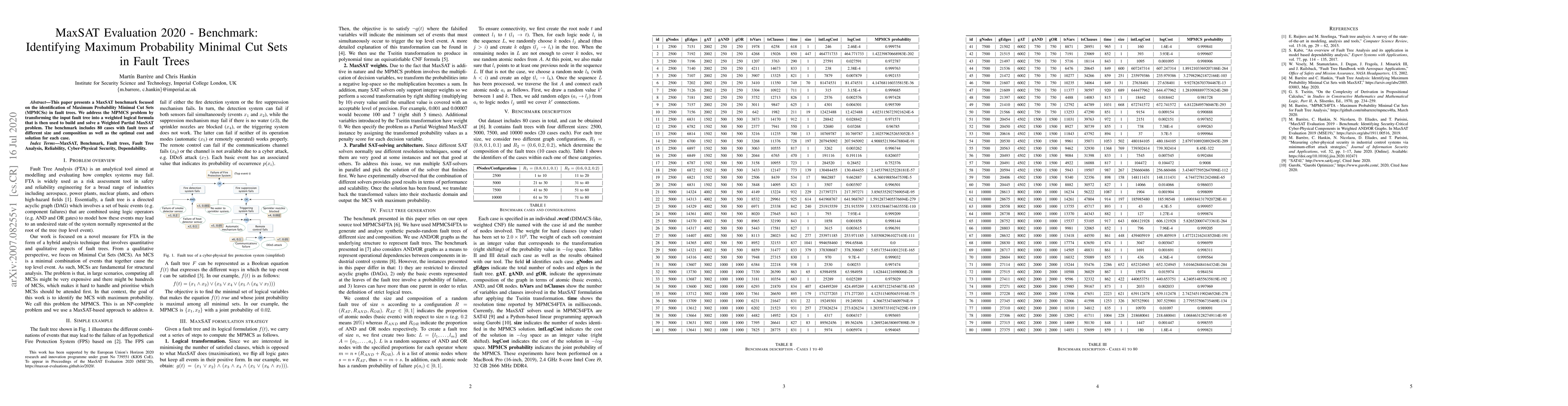 This paper presents a MaxSAT benchmark focused on the identification of Maximum Probability Minimal Cut Sets (MPMCSs) in fault trees. We address the MPMCS problem by transforming the input fault tree into a weighted logical formula that is then used to build and solve a Weighted Partial MaxSAT problem. The benchmark includes 80 cases with fault trees of different size and composition as well as the optimal cost and solution for each case.