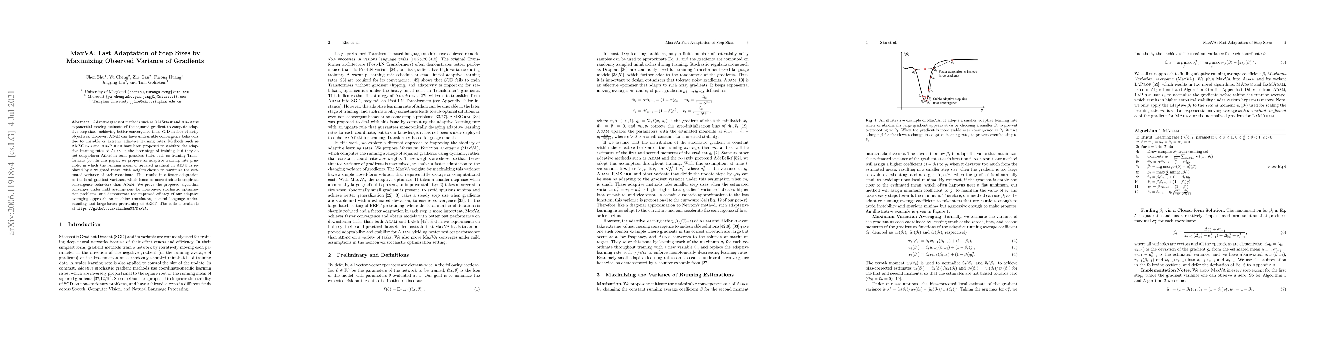 This paper proposes a new adaptive learning rate method called MaxVA that maximizes observed variance of gradients to stabilize convergence, achieving improved efficacy in machine translation and natural language understanding tasks.