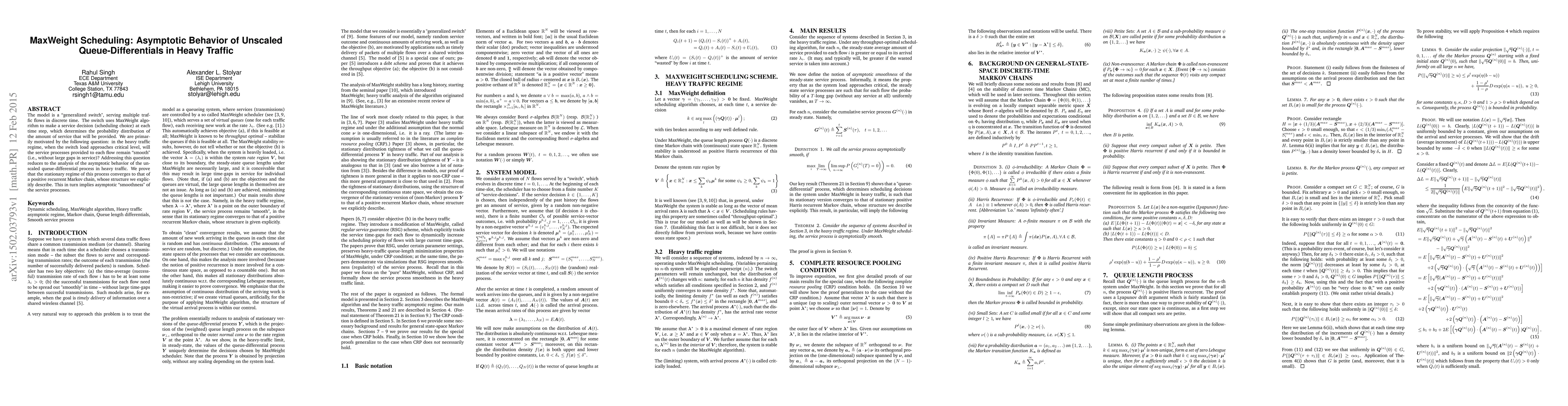 The paper establishes the convergence of the unscaled queue-differential process to a positive recurrent Markov chain in heavy traffic, providing a theoretical foundation for understanding the stability and smoothness of service processes under the MaxWeight scheduling algorithm.