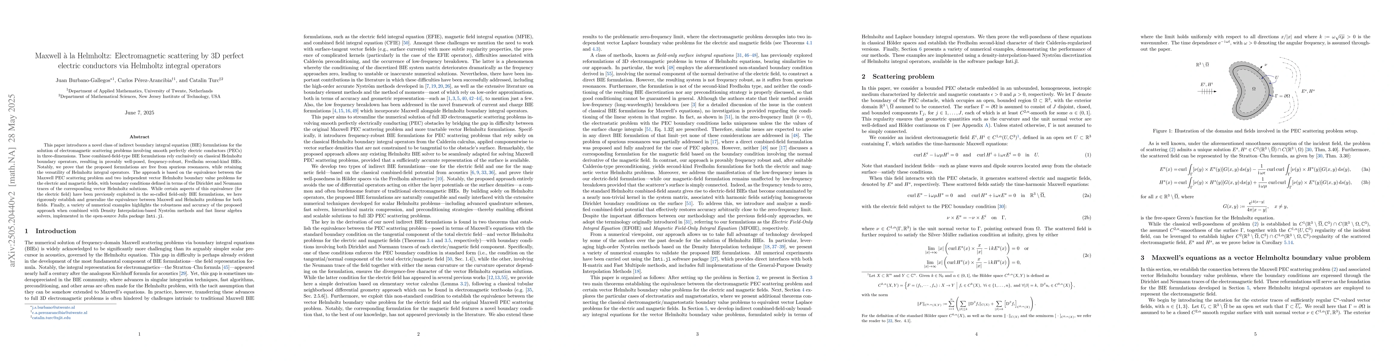 The approach combines Maxwell's equations with Helmholtz integral operators, providing a new perspective on solving electromagnetic scattering problems by PECs, free from spurious resonances and robust across frequencies.