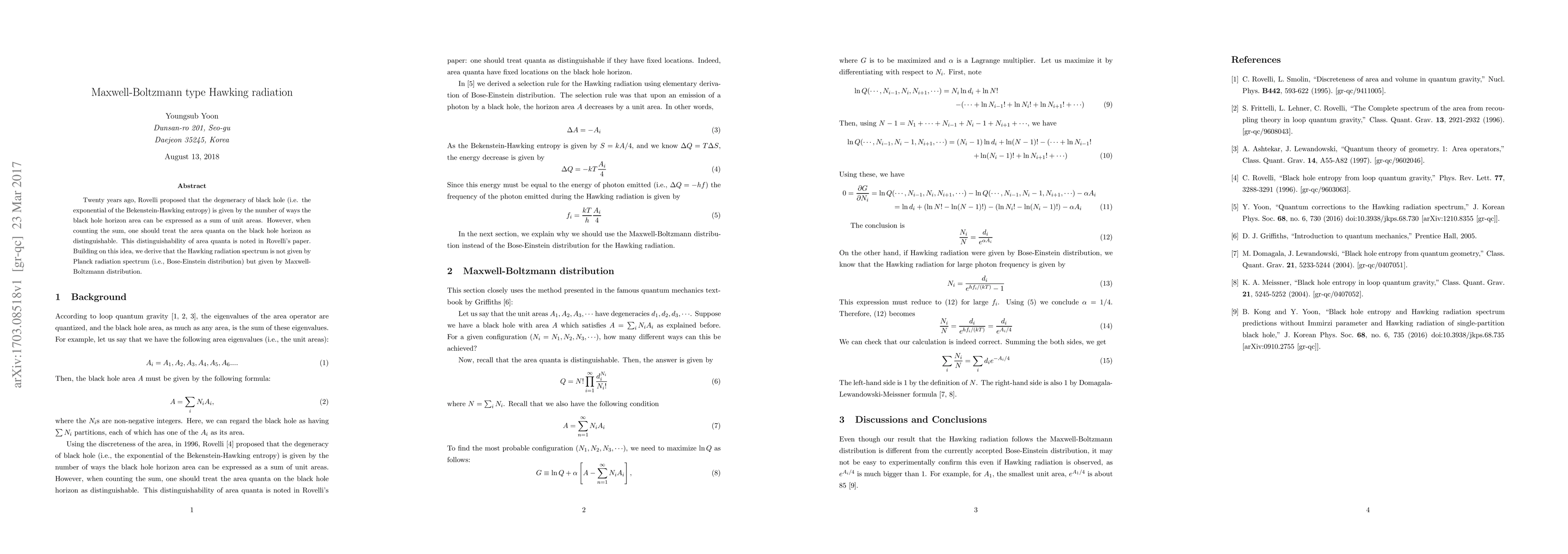 Twenty years ago, Rovelli proposed that the degeneracy of black hole (i.e. the exponential of the Bekenstein-Hawking entropy) is given by the number of ways the black hole horizon area can be expressed as a sum of unit areas. However, when counting the sum, one should treat the area quanta on the black hole horizon as distinguishable. This distinguishability of area quanta is noted in Rovelli's paper. Building on this idea, we derive that the Hawking radiation spectrum is not given by Planck radiation spectrum (i.e., Bose-Einstein distribution) but given by Maxwell-Boltzmann distribution.