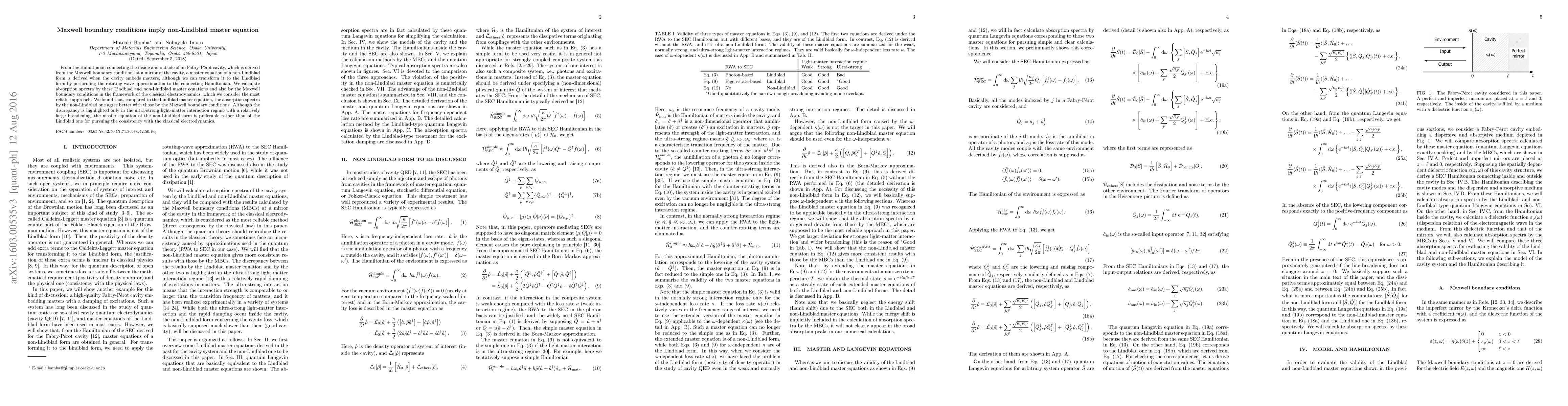 From the Hamiltonian connecting the inside and outside of an Fabry-Perot cavity, which is derived from the Maxwell boundary conditions at a mirror of the cavity, a master equation of a non-Lindblad form is derived when the cavity embeds matters, although we can transform it to the Lindblad form by performing the rotating-wave approximation to the connecting Hamiltonian. We calculate absorption spectra by these Lindblad and non-Lindblad master equations and also by the Maxwell boundary conditions in the framework of the classical electrodynamics, which we consider the most reliable approach. We found that, compared to the Lindblad master equation, the absorption spectra by the non-Lindblad one agree better with those by the Maxwell boundary conditions. Although the discrepancy is highlighted only in the ultra-strong light-matter interaction regime with a relatively large broadening, the master equation of the non-Lindblad form is preferable rather than of the Lindblad one for pursuing the consistency with the classical electrodynamics.
