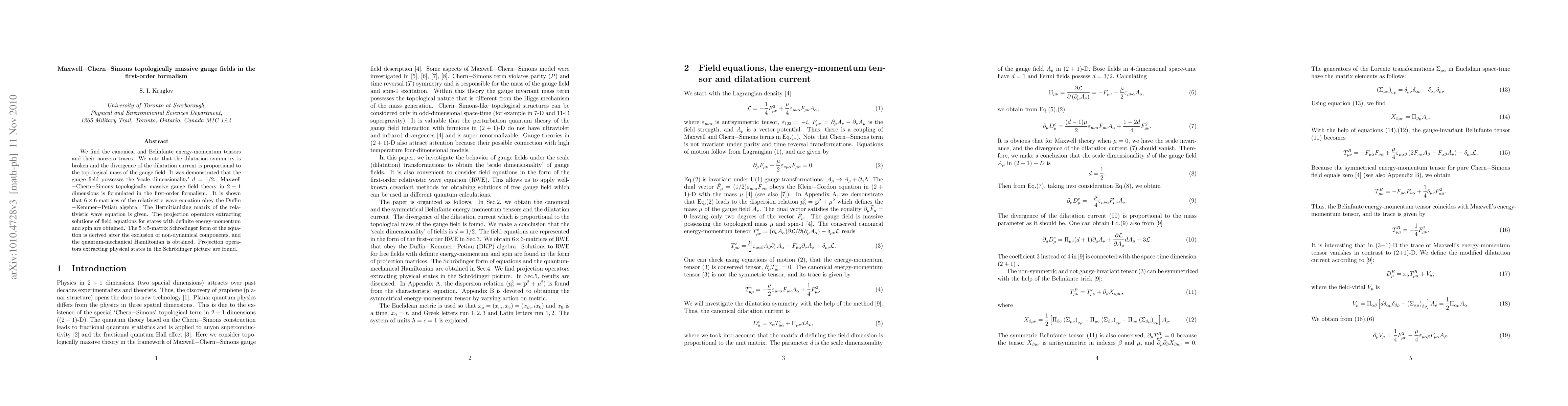 This paper formulates Maxwell-Chern-Simons topologically massive gauge fields in 2+1 dimensions using the first-order formalism, deriving canonical and Belinfante energy-momentum tensors and noting broken dilatation symmetry. It also explores the relativistic wave equation's 6x6-matrices and derives a 5x5-matrix Schrödinger form to obtain the quantum-mechanical Hamiltonian and projection operators for physical states.