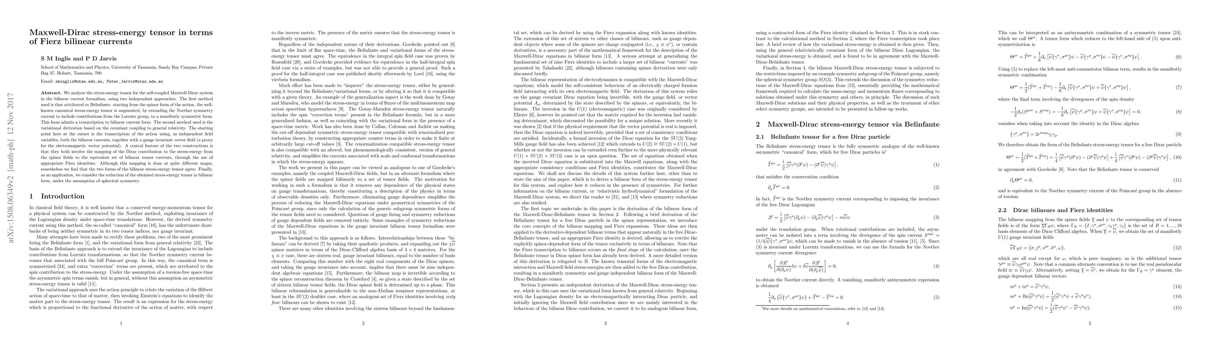 The paper presents a detailed derivation of the Maxwell-Dirac stress-energy tensor in terms of Fierz bilinear currents, validating the bilinear representation and demonstrating its equivalence through two independent approaches.