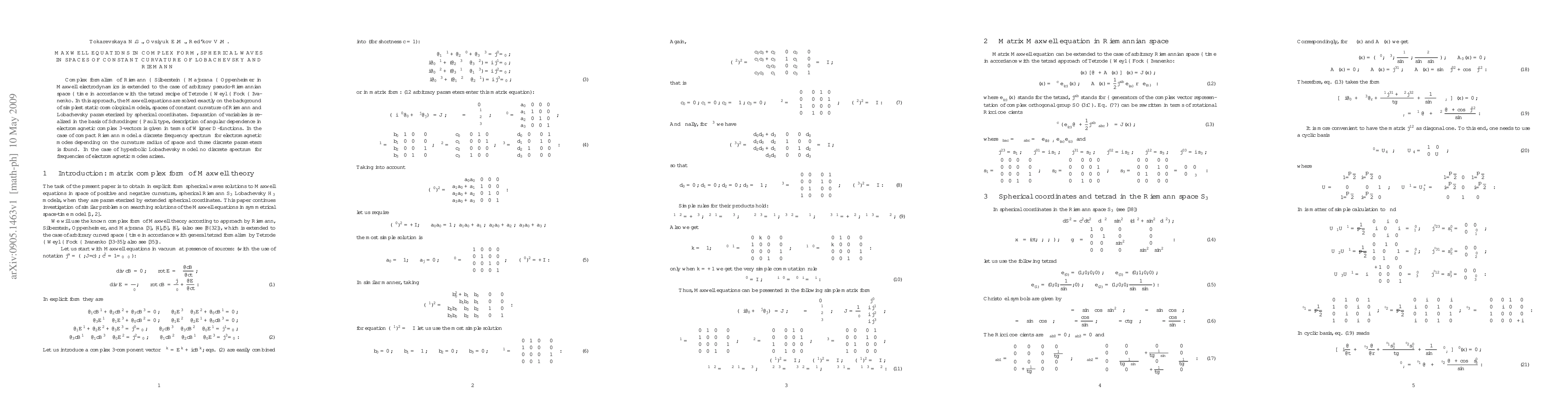 This paper extends the complex formalism of Maxwell electrodynamics to arbitrary pseudo-Riemannian space-time, solving the Maxwell equations in spaces of constant curvature, specifically Riemann and Lobachevsky, using a tetrad recipe. It finds a discrete frequency spectrum for electromagnetic modes in the compact Riemann model but not in the hyperbolic Lobachevsky model.