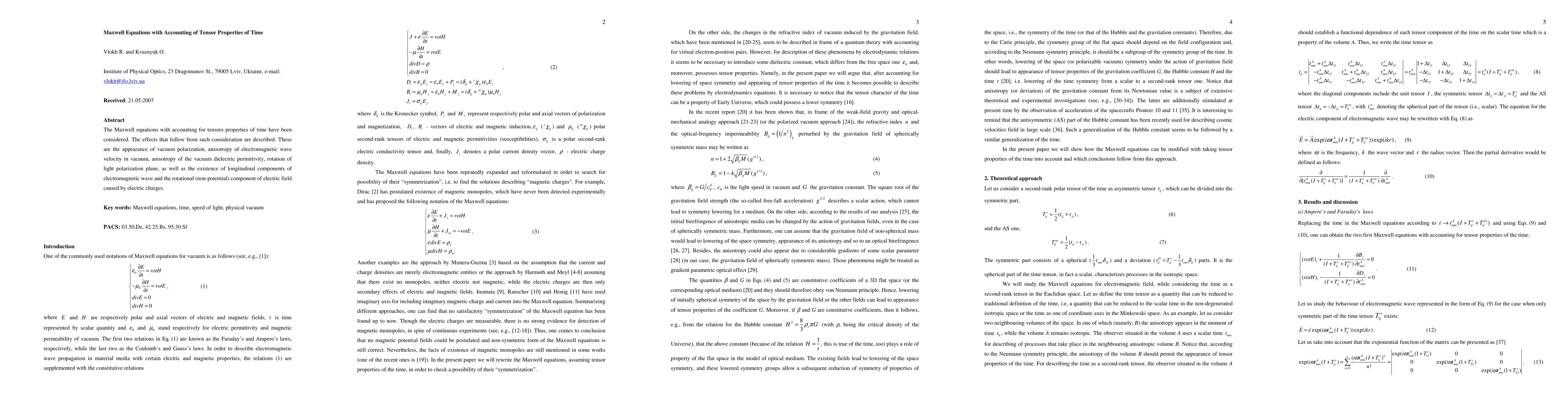 This paper explores the Maxwell equations modified to include tensor properties of time, revealing effects such as vacuum polarization, anisotropic electromagnetic wave velocity, and the emergence of longitudinal electromagnetic wave components and rotational electric fields.