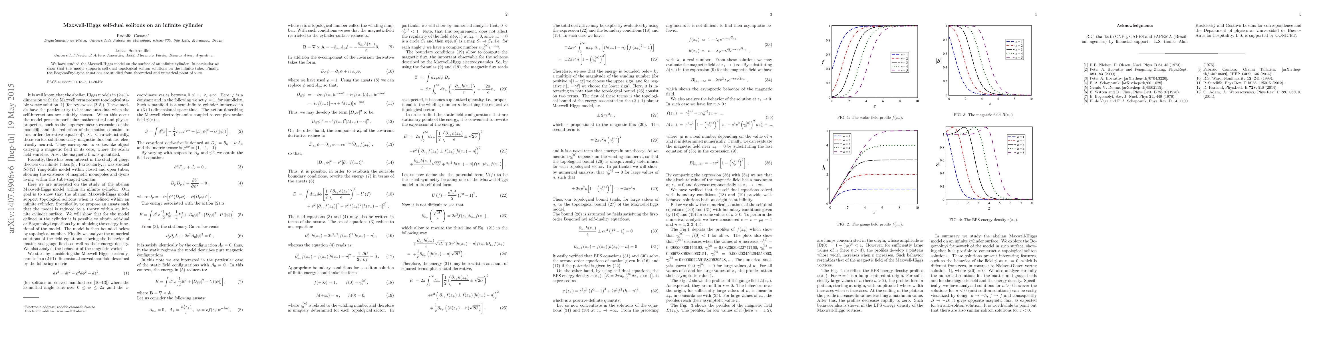 This paper explores the Maxwell-Higgs model on the infinite cylinder, revealing self-dual topological soliton solutions. It also investigates Bogomol'nyi-type equations both theoretically and numerically.