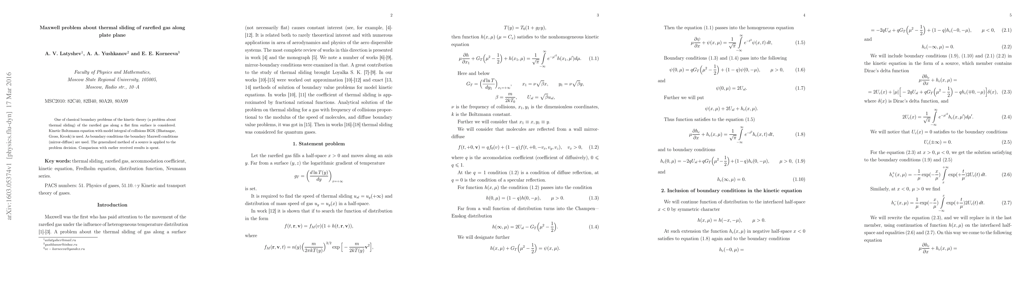 This paper solves a classical boundary problem in kinetic theory using the BGK model and Maxwell conditions, providing new results for thermal sliding of rarefied gases along plates.