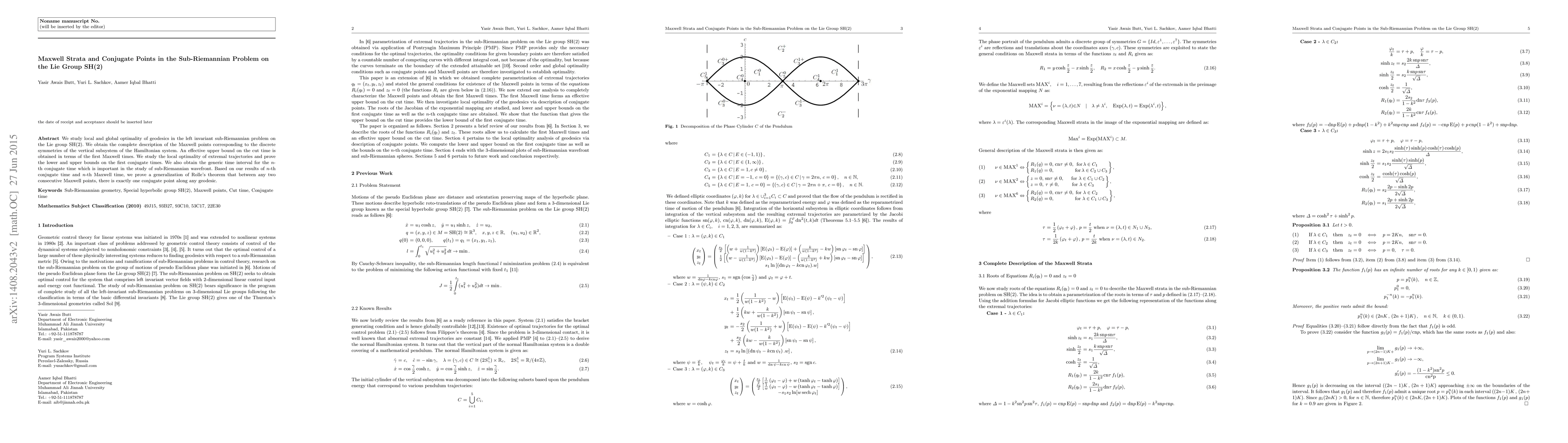 We study local and global optimality of geodesics in the left invariant sub-Riemannian problem on the Lie group $\mathrm{SH}(2)$. We obtain the complete description of the Maxwell points corresponding to the discrete symmetries of the vertical subsystem of the Hamiltonian system. An effective upper bound on the cut time is obtained in terms of the first Maxwell times. We study the local optimality of extremal trajectories and prove the lower and upper bounds on the first conjugate times. We also obtain the generic time interval for the $n$-th conjugate time which is important in the study of sub-Riemannian wavefront. Based on our results of $n$-th conjugate time and $n$-th Maxwell time, we prove a generalization of Rolle's theorem that between any two consecutive Maxwell points, there is exactly one conjugate point along any geodesic.