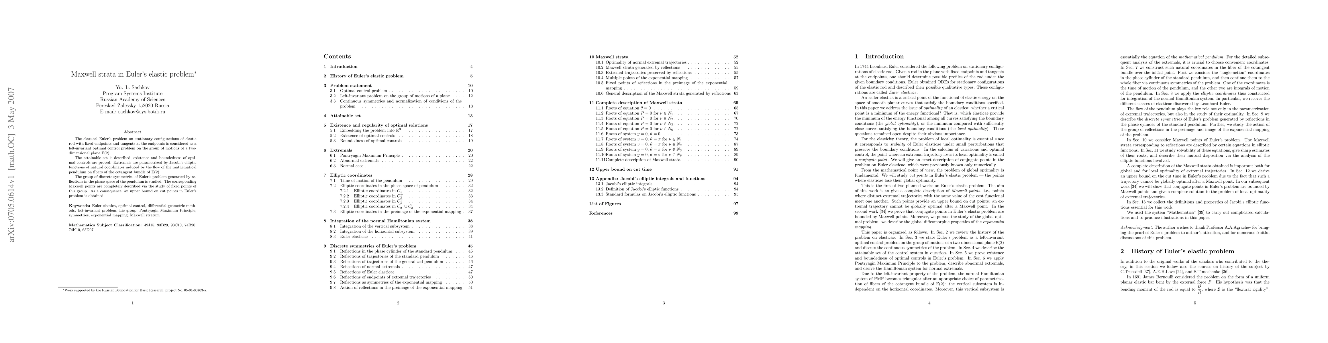 The classical Euler's problem on stationary configurations of elastic rod with fixed endpoints and tangents at the endpoints is considered as a left-invariant optimal control problem on the group of motions of a two-dimensional plane $\E(2)$. The attainable set is described, existence and boundedness of optimal controls are proved. Extremals are parametrized by Jacobi's elliptic functions of natural coordinates induced by the flow of the mathematical pendulum on fibers of the cotangent bundle of $\E(2)$. The group of discrete symmetries of Euler's problem generated by reflections in the phase space of the pendulum is studied. The corresponding Maxwell points are completely described via the study of fixed points of this group. As a consequence, an upper bound on cut points in Euler's problem is obtained.