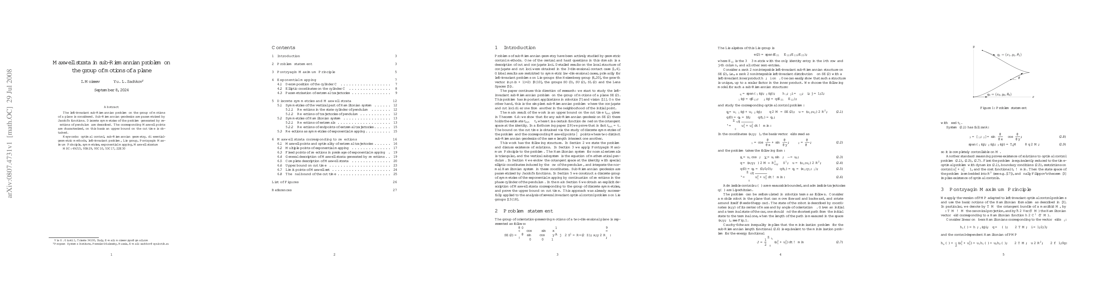This paper examines the left-invariant sub-Riemannian problem on the group of plane motions, identifying sub-Riemannian geodesics through Jacobi's functions and characterizing Maxwell points based on pendulum reflections, ultimately providing an upper bound on the cut time.