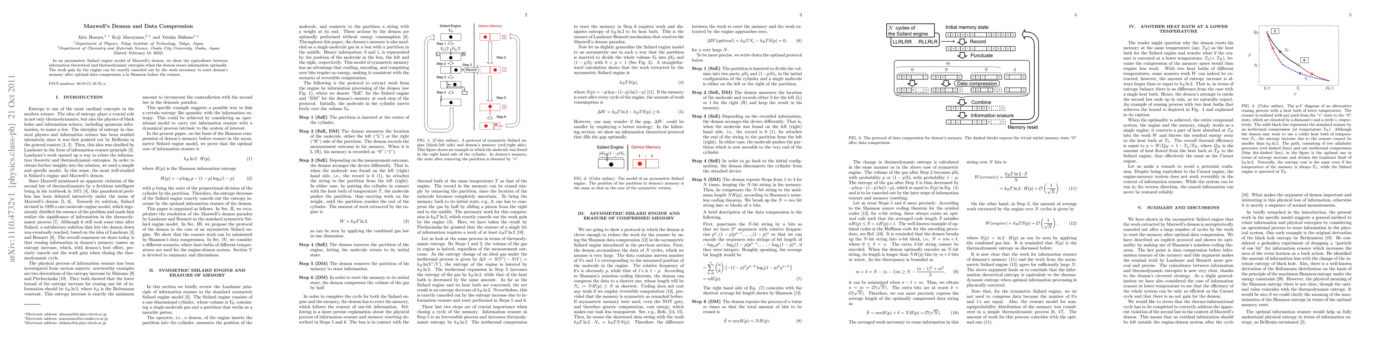 This paper demonstrates that in an asymmetric Szilard engine model, the thermodynamic gain from Maxwell's demon can be offset by the work required to reset the demon's memory after optimal data compression, showing equivalence between information theoretical and thermodynamic entropies. The optimal erasure of information leads to a balance between the engine's work gain and the work needed for memory reset.