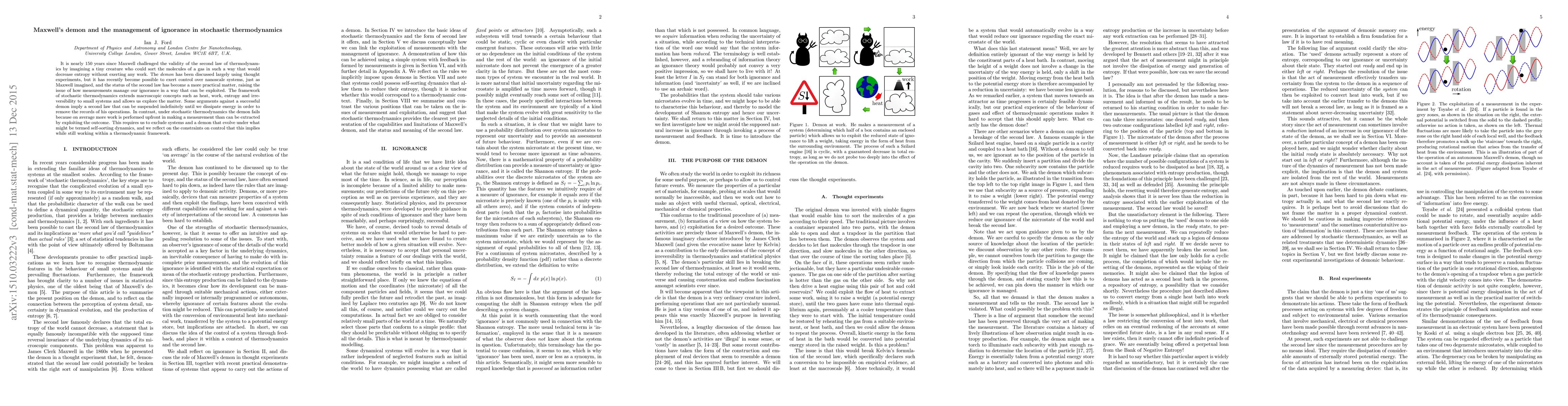 It is nearly 150 years since Maxwell challenged the validity of the second law of thermodynamics by imagining a tiny creature who could sort the molecules of a gas in such a way that would decrease entropy without exerting any work. The demon has been discussed largely using thought experiments, but it has recently become possible to exert control over nanoscale systems, just as Maxwell imagined, and the status of the second law has become a more practical matter, raising the issue of how measurements manage our ignorance in a way that can be exploited. The framework of stochastic thermodynamics extends macroscopic concepts such as heat, work, entropy and irreversibility to small systems and allows us explore the matter. Some arguments against a successful demon imply a second law that can be suspended indefinitely until we dissipate energy in order to remove the records of his operations. In contrast, under stochastic thermodynamics the demon fails because on average more work is performed upfront in making a measurement than is to be extracted by exploiting the outcome. This requires us to exclude systems and a demon that evolve under what might be termed self-sorting dynamics, and we reflect on the constraints on control that this implies while still working within a thermodynamic framework.