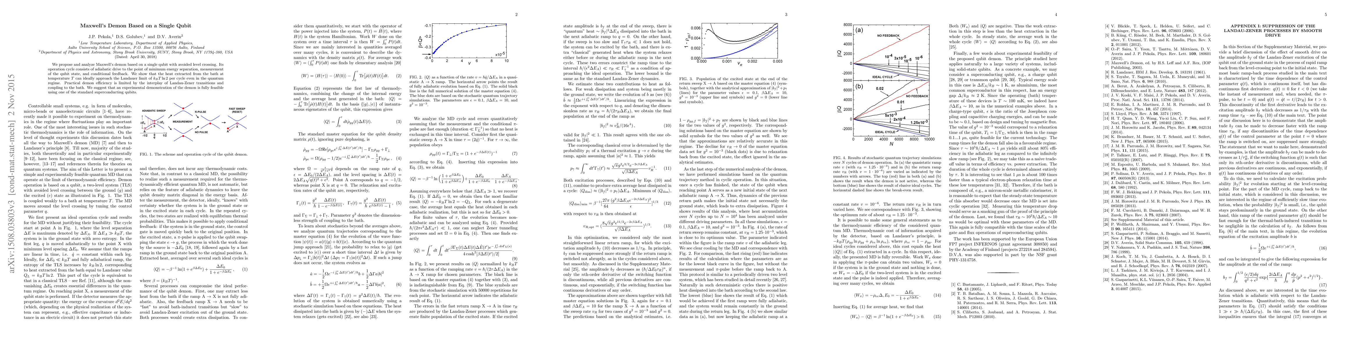 This paper proposes a Maxwell's demon operating on a single qubit with an adiabatic drive, measurement, and conditional feedback, showing it can theoretically extract heat approaching the Landauer limit in the quantum regime. Practical efficiency is constrained by Landau-Zener transitions and bath coupling, with potential experimental feasibility using superconducting qubits.