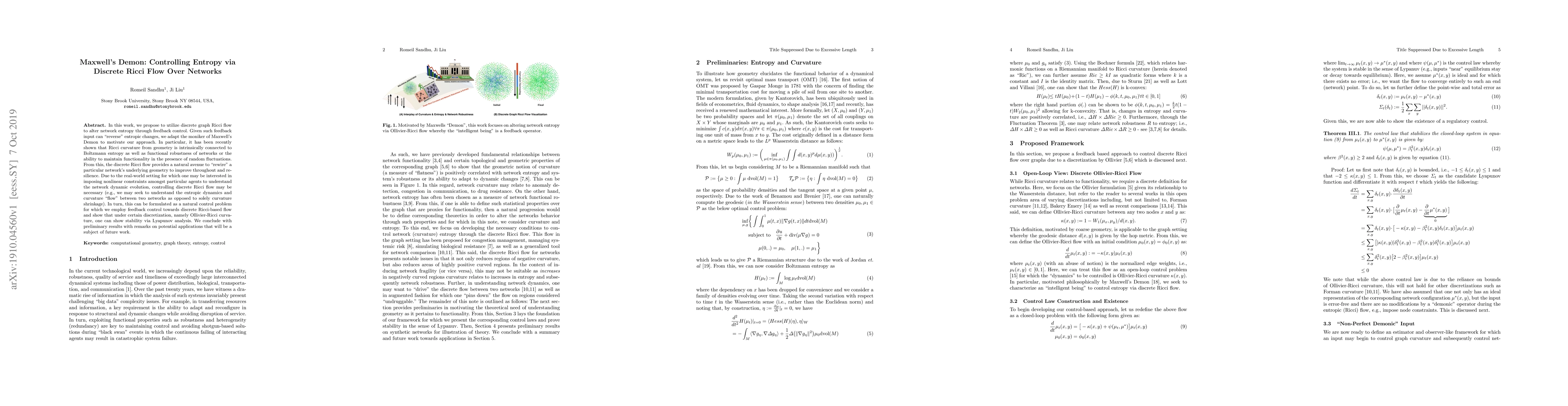 In this work, we propose to utilize discrete graph Ricci flow to alter network entropy through feedback control. Given such feedback input can reverse entropic changes, we adapt the moniker of Maxwells Demon to motivate our approach. In particular, it has been recently shown that Ricci curvature from geometry is intrinsically connected to Boltzmann entropy as well as functional robustness of networks or the ability to maintain functionality in the presence of random fluctuations. From this, the discrete Ricci flow provides a natural avenue to rewire a particular networks underlying geometry to improve throughout and resilience. Due to the real-world setting for which one may be interested in imposing nonlinear constraints amongst particular agents to understand the network dynamic evolution, controlling discrete Ricci flow may be necessary (e.g., we may seek to understand the entropic dynamics and curvature flow between two networks as opposed to solely curvature shrinkage). In turn, this can be formulated as a natural control problem for which we employ feedback control towards discrete Ricci-based flow and show that under certain discretization, namely Ollivier-Ricci curvature, one can show stability via Lyapunov analysis. We conclude with preliminary results with remarks on potential applications that will be a subject of future work.