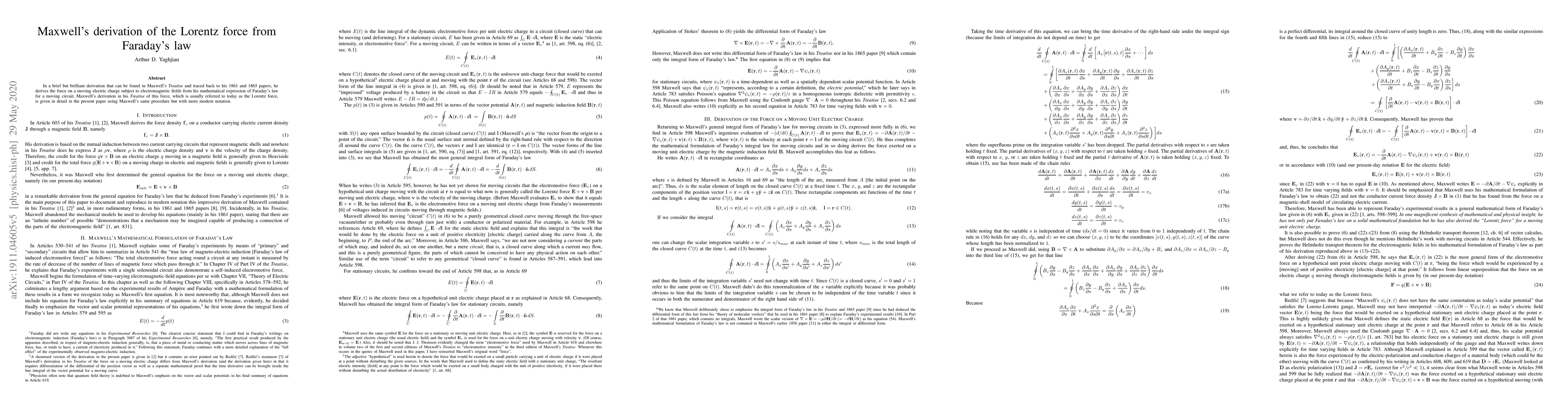 In a brief but brilliant derivation that can be found in Maxwell's Treatise and traced back to his 1861 and 1865 papers, he derives the force on a moving electric charge subject to electromagnetic fields from his mathematical expression of Faraday's law for a moving circuit. Maxwell's derivation in his Treatise of this force, which is usually referred to today as the Lorentz force, is given in detail in the present paper using Maxwell's same procedure but with more modern notation.