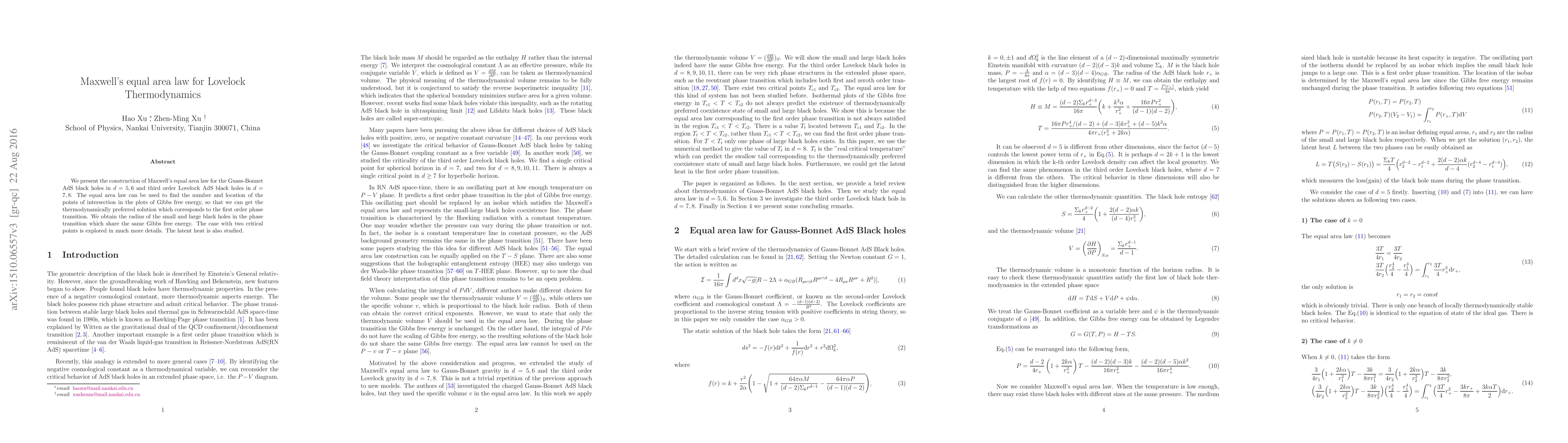 This paper constructs Maxwell's equal area law for Lovelock thermodynamics in specific dimensions, identifying the points of intersection in Gibbs free energy plots to determine thermodynamically preferred solutions for first-order phase transitions, and explores the radius of black holes involved in these transitions, with a detailed examination of cases with two critical points and latent heat.