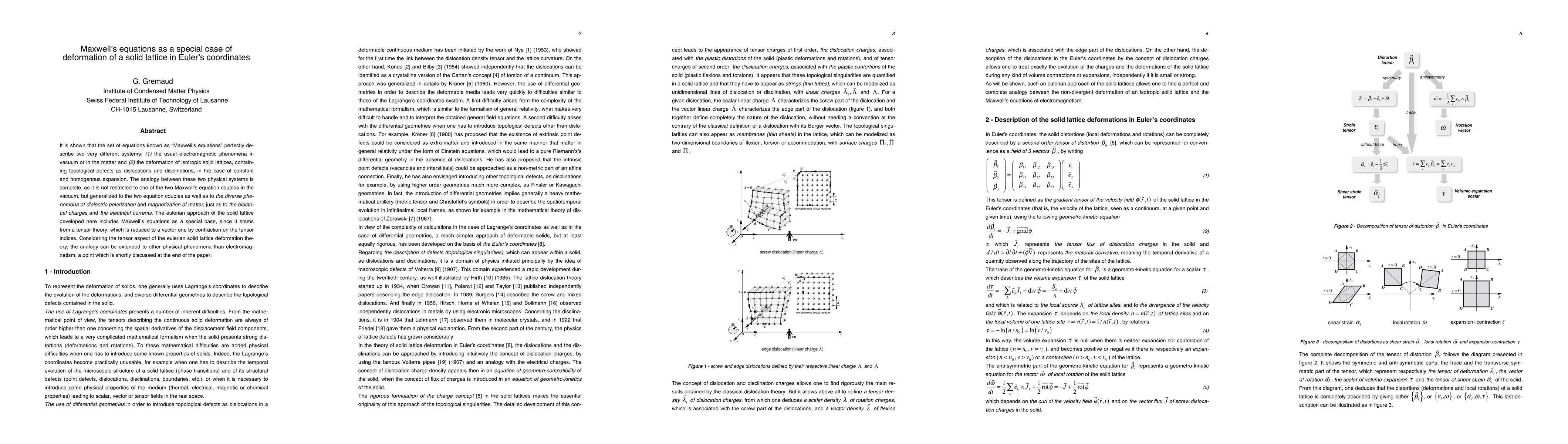 It is shown that the set of equations known as Maxwell's equations perfectly describe two very different systems: (1) the usual electromagnetic phenomena in vacuum or in the matter and (2) the deformation of isotropic solid lattices, containing topological defects as dislocations and disclinations, in the case of constant and homogenous expansion. The analogy between these two physical systems is complete, as it is not restricted to one of the two Maxwell's equation couples in the vacuum, but generalized to the two equation couples as well as to the diverse phenomena of dielectric polarization and magnetization of matter, just as to the electrical charges and the electrical currents. The eulerian approach of the solid lattice developed here includes Maxwell's equations as a special case, since it stems from a tensor theory, which is reduced to a vector one by contraction on the tensor indices. Considering the tensor aspect of the eulerian solid lattice deformation theory, the analogy can be extended to other physical phenomena than electromagnetism, a point which is shortly discussed at the end of the paper.