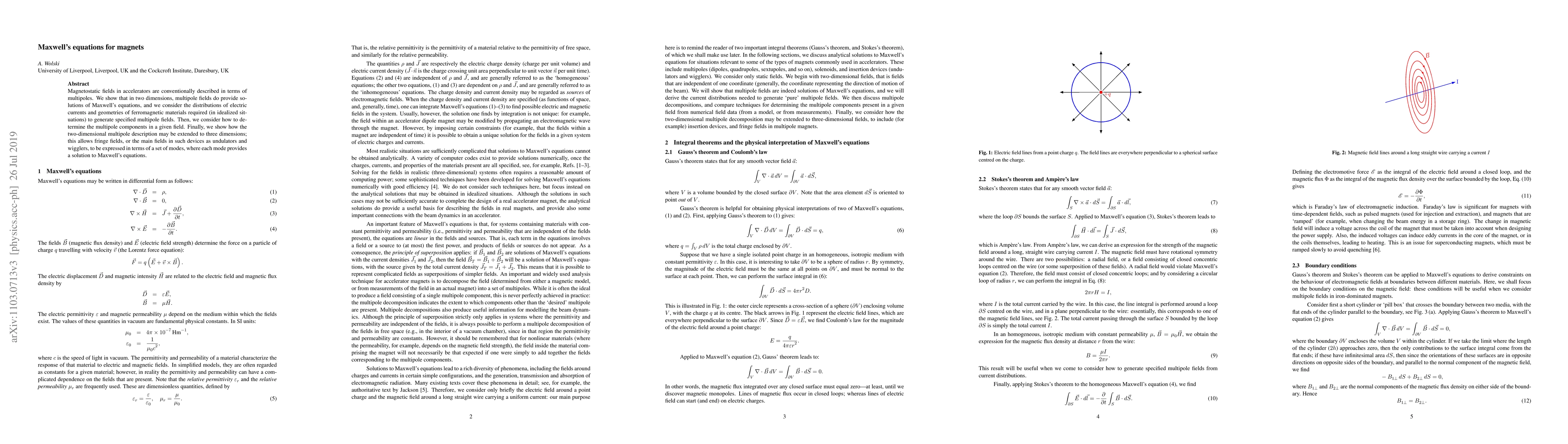 This paper demonstrates that multipole fields in two dimensions solve Maxwell's equations and explores the necessary current distributions and ferromagnetic geometries to generate these fields. It also extends the two-dimensional multipole description to three dimensions, allowing for the expression of fringe fields and main fields in devices like undulators and wigglers in terms of modes that satisfy Maxwell's equations.